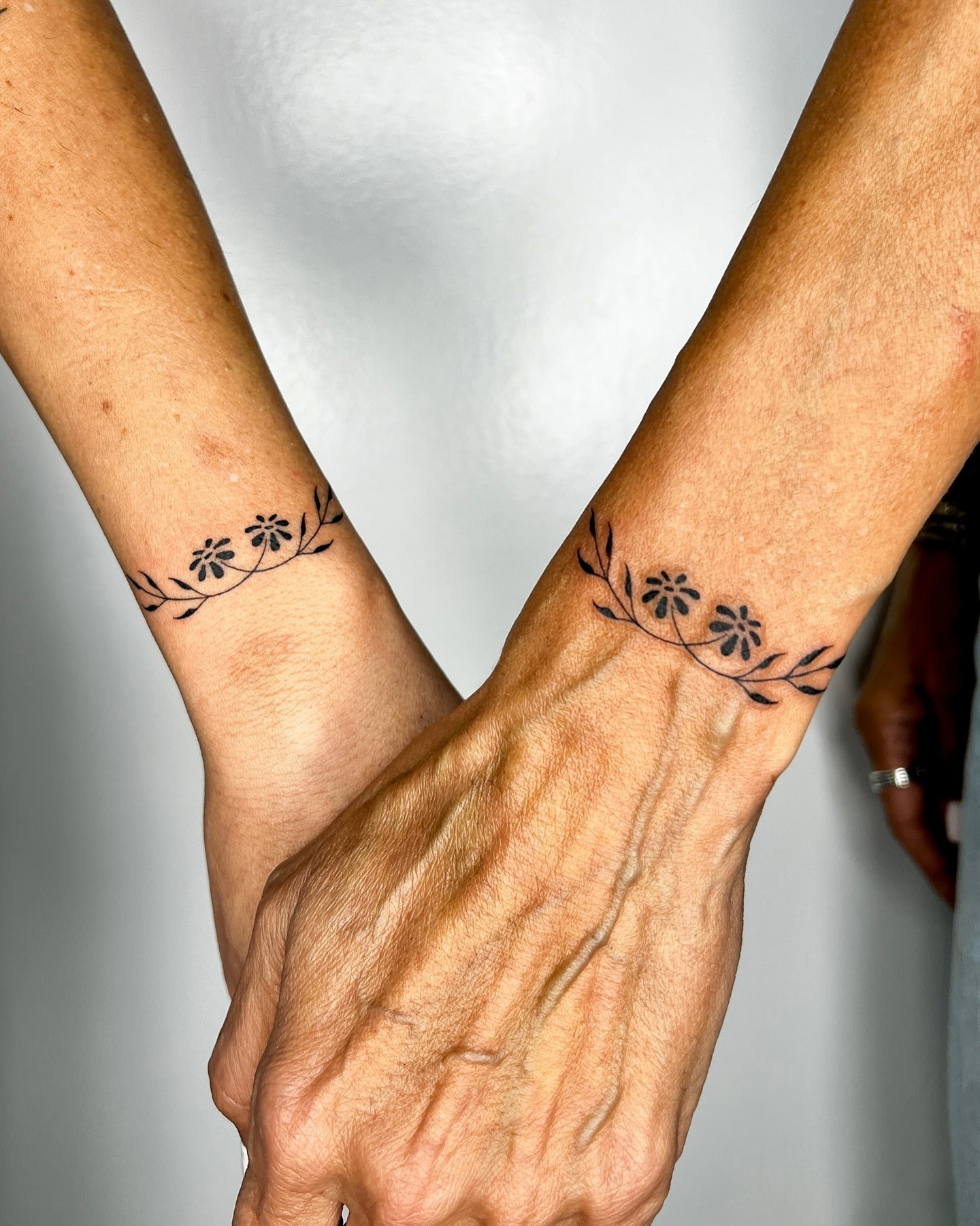 This image showcases a beautiful moment between two people, each sporting delicate floral tattoos on their wrists. The designs symbolize togetherness and shared experiences, making them perfect for a parent-child duo. Choosing matching tattoos can be a meaningful way to celebrate a special bond or memory that lasts a lifetime.