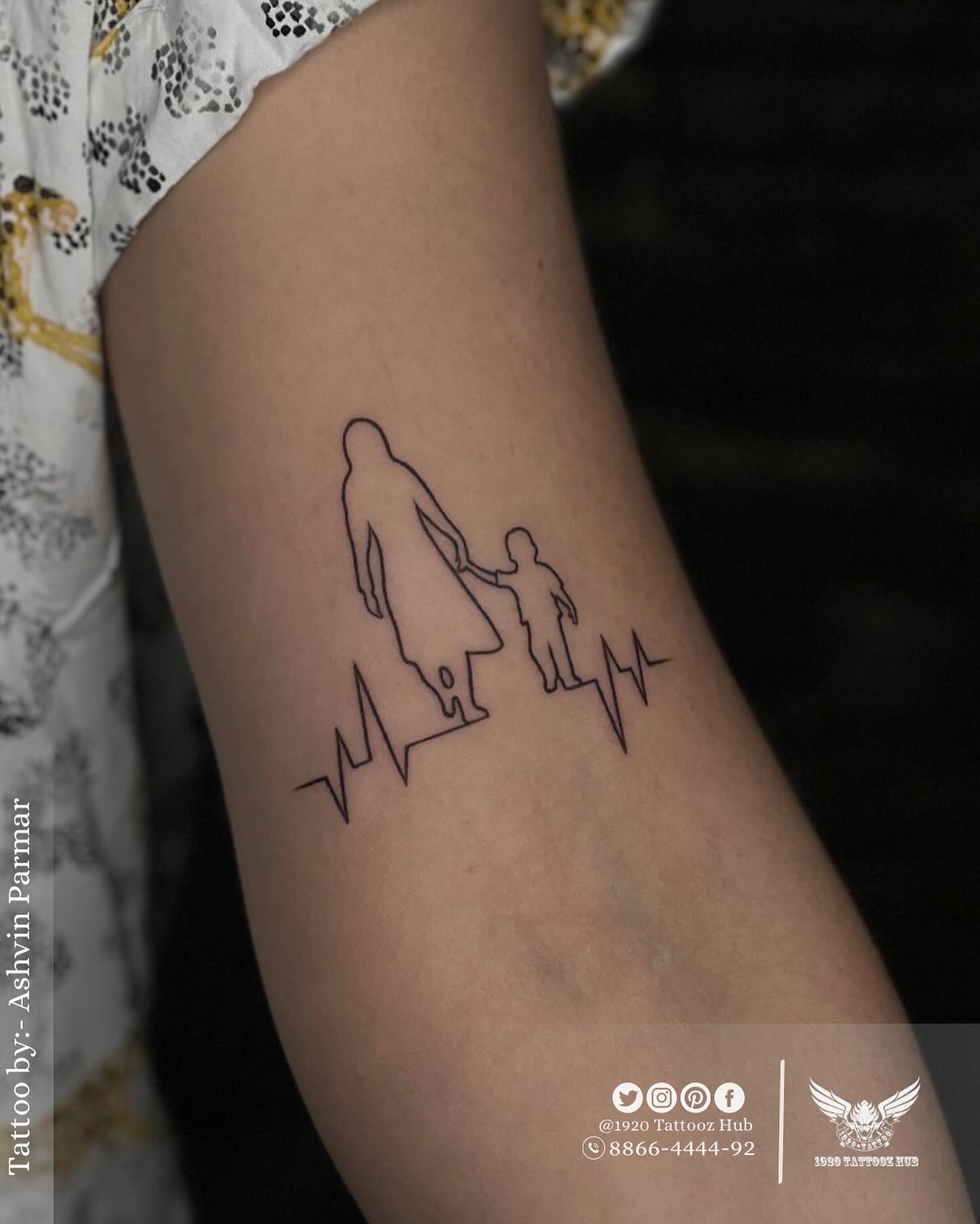 This tattoo beautifully captures a tender moment between a parent and child, showcasing their bond in a simple yet striking design. The heartbeat line beneath the figures adds a unique touch, symbolizing the life and love shared between them. For anyone considering a tattoo that represents family, this design is a wonderful reminder of those cherished connections.