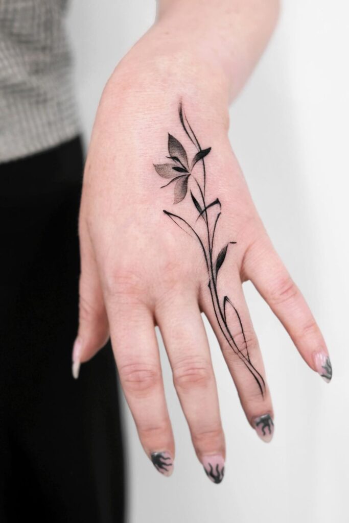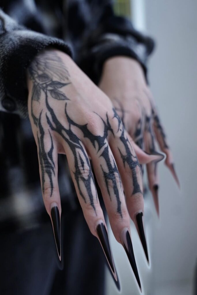 Bold black ink creeps across the fingers like wild vines, creating a stark and edgy statement.