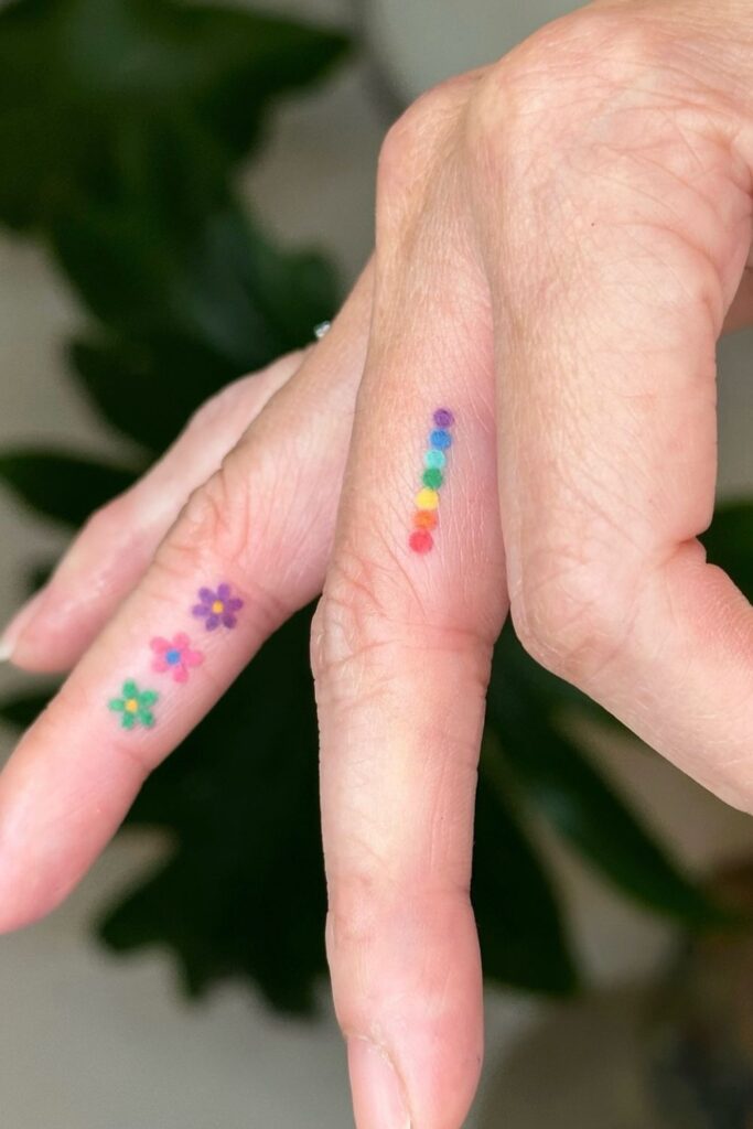 Tiny blossoms paired with playful dotted accents bring a sweet charm to this minimalist finger tattoo.