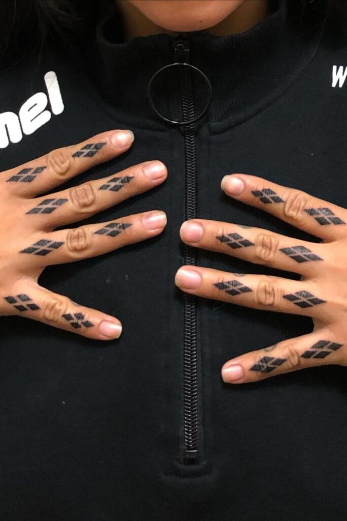 Diamond-shaped clusters in solid black ink line the fingers in a striking, repeating pattern.