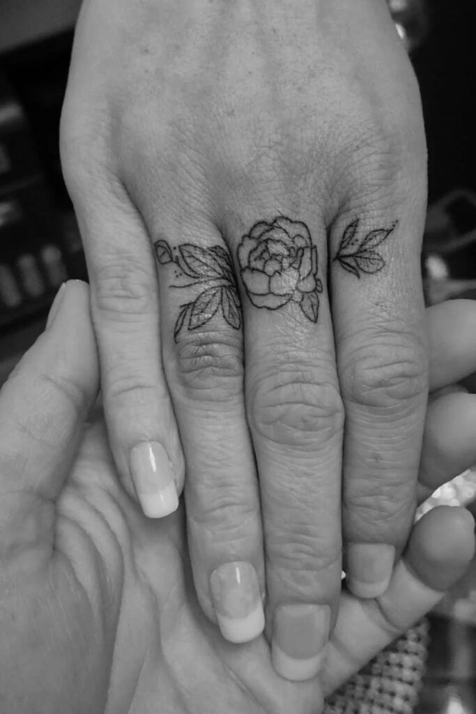 A dainty rose bloom stretches across the fingers, flanked by subtle leaves in delicate black ink.