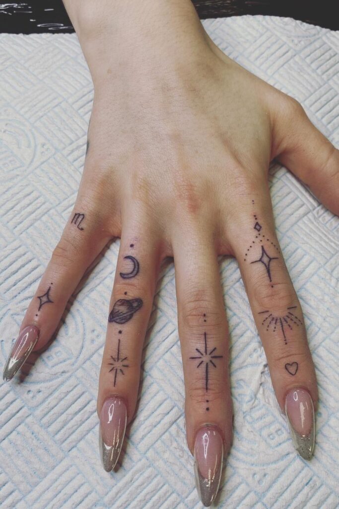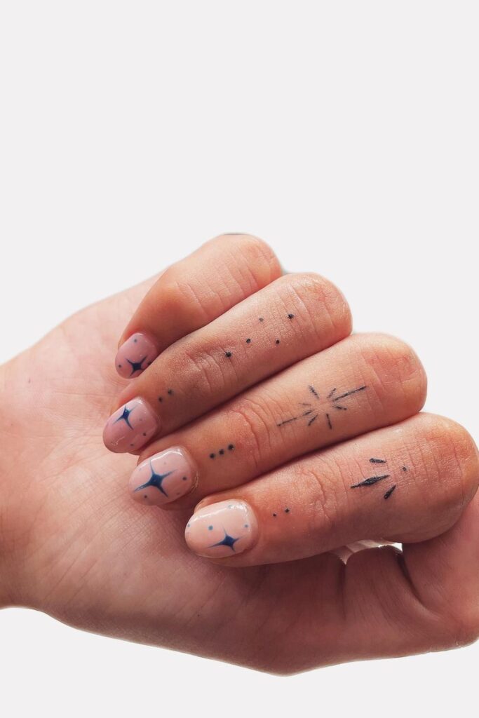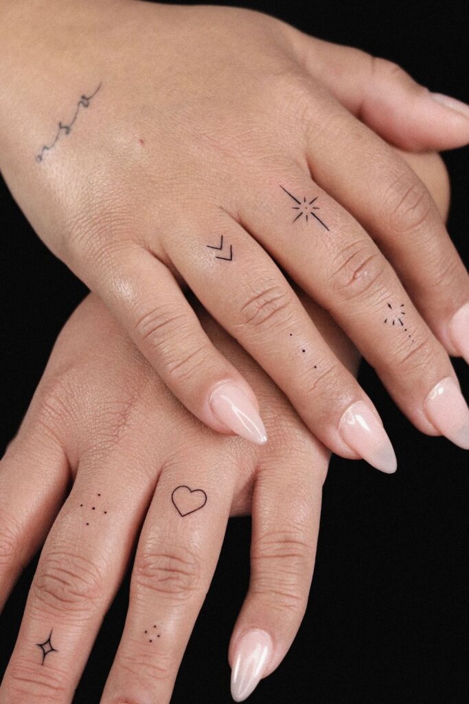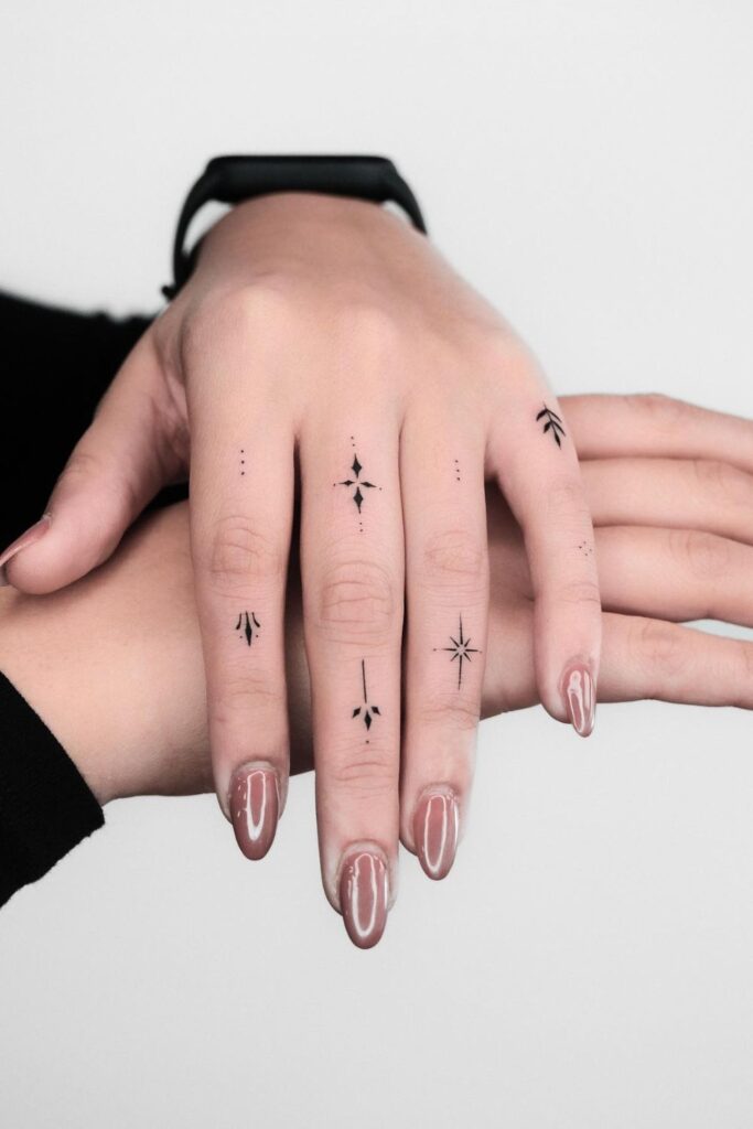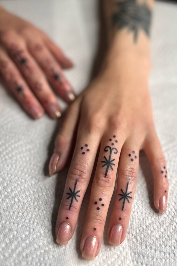 Dainty stars and bold geometric accents bring life to these finger tattoos, adding a celestial flair to every gesture.
