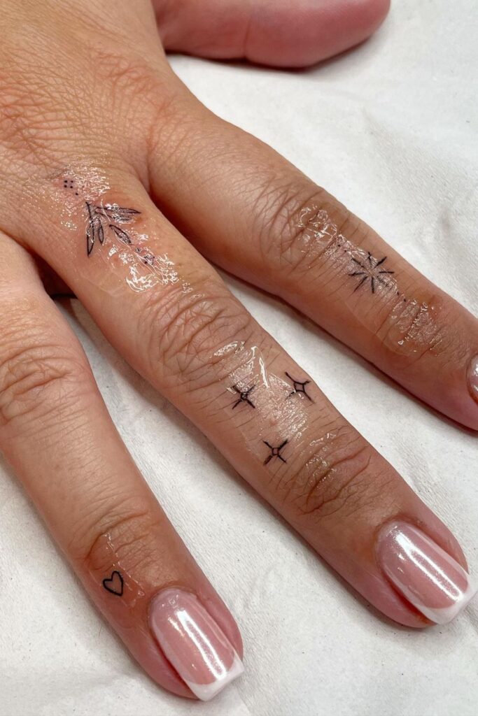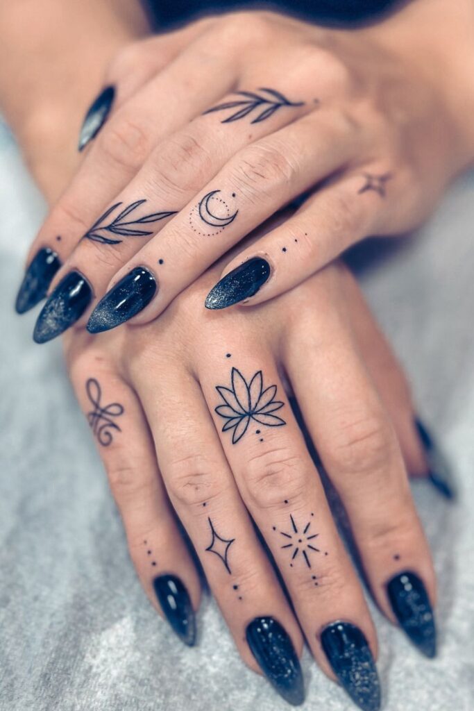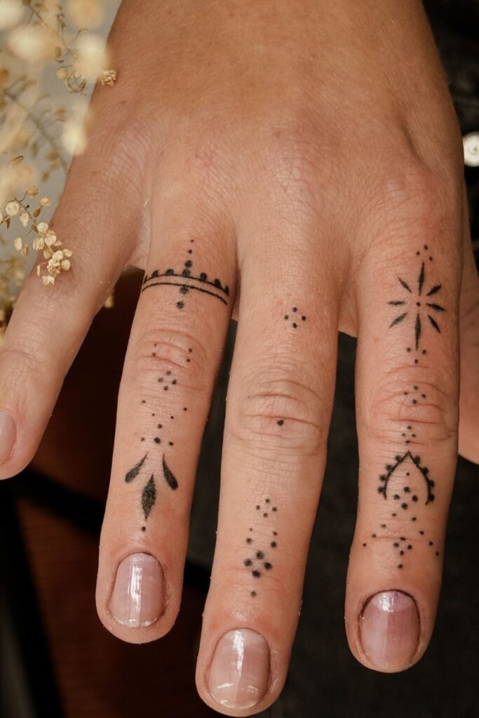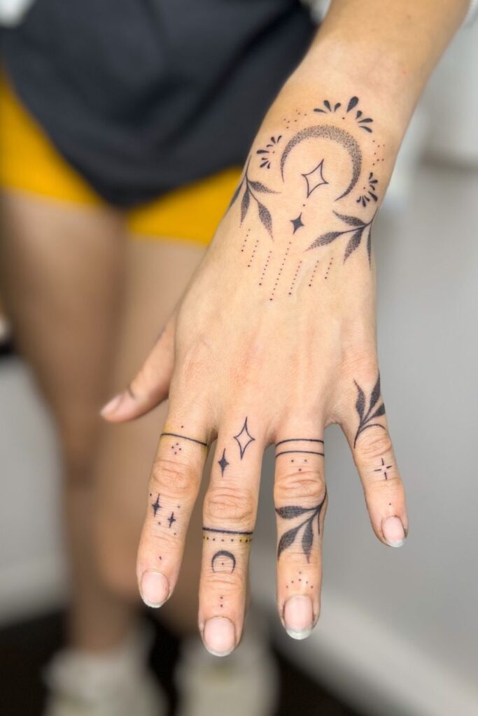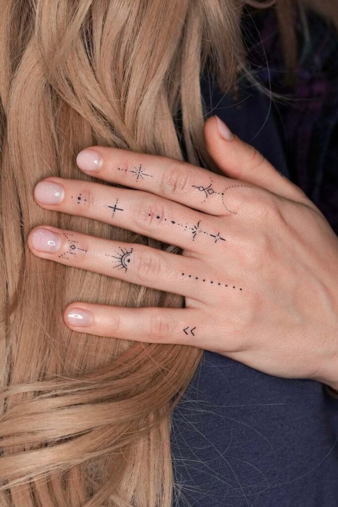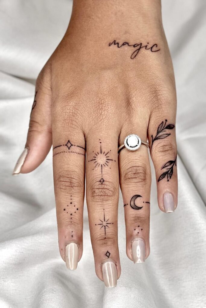 Dainty stars and bold geometric accents bring life to these finger tattoos, adding a celestial flair to every gesture.
