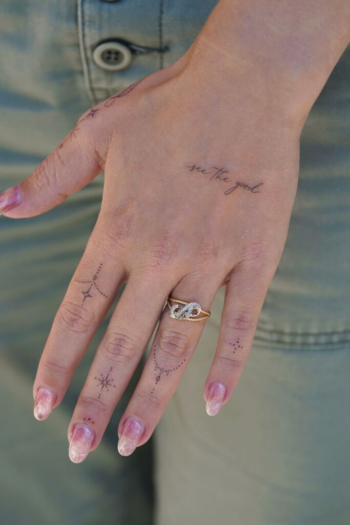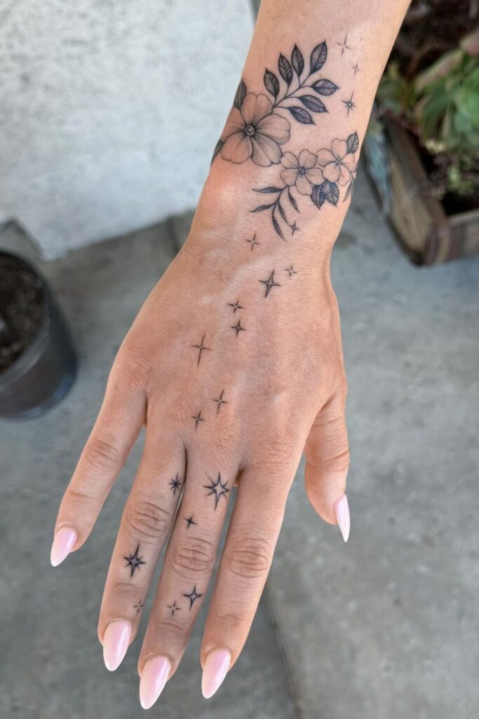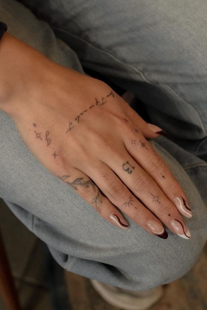 An elegant script dances across the back of the hand, framed by petite starbursts and subtle dotted accents.