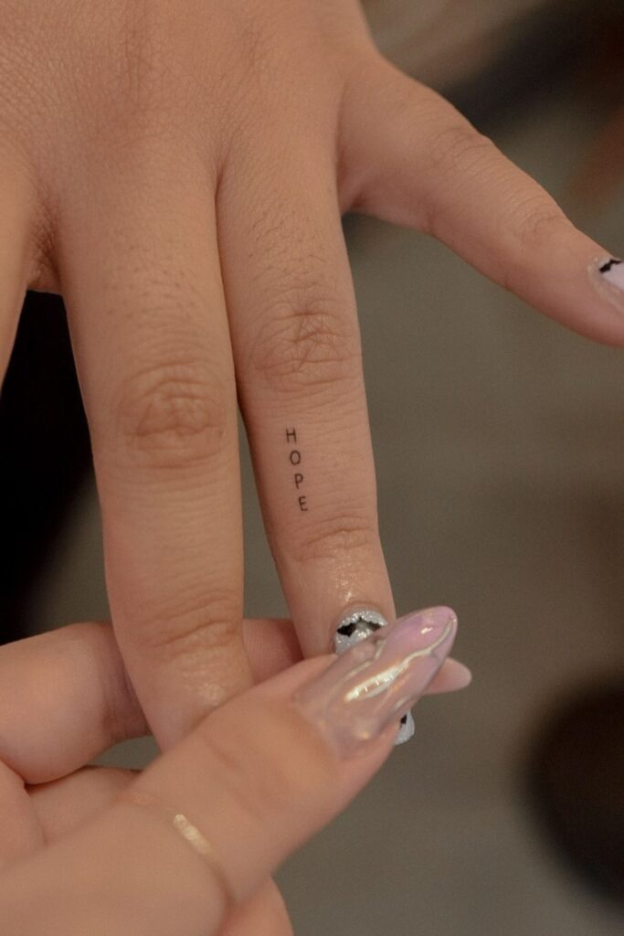 A single word inked down the finger can carry an entire world of meaning, like this âHOPEâ piece.