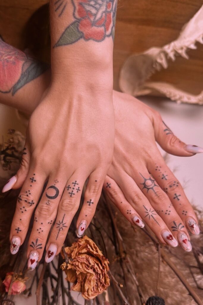 Tiny crosses, mini dots, and a dainty moon create a mystical collage across the hands.