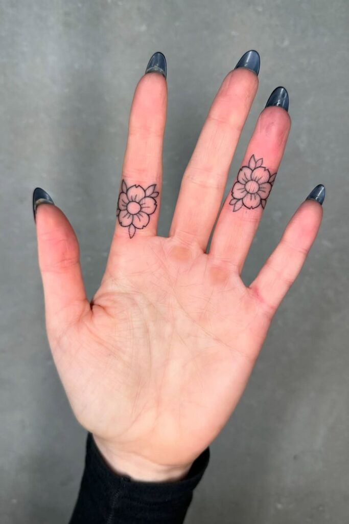 Two dainty flower designs hug the fingers, showcasing the harmony of nature in a small but potent display.