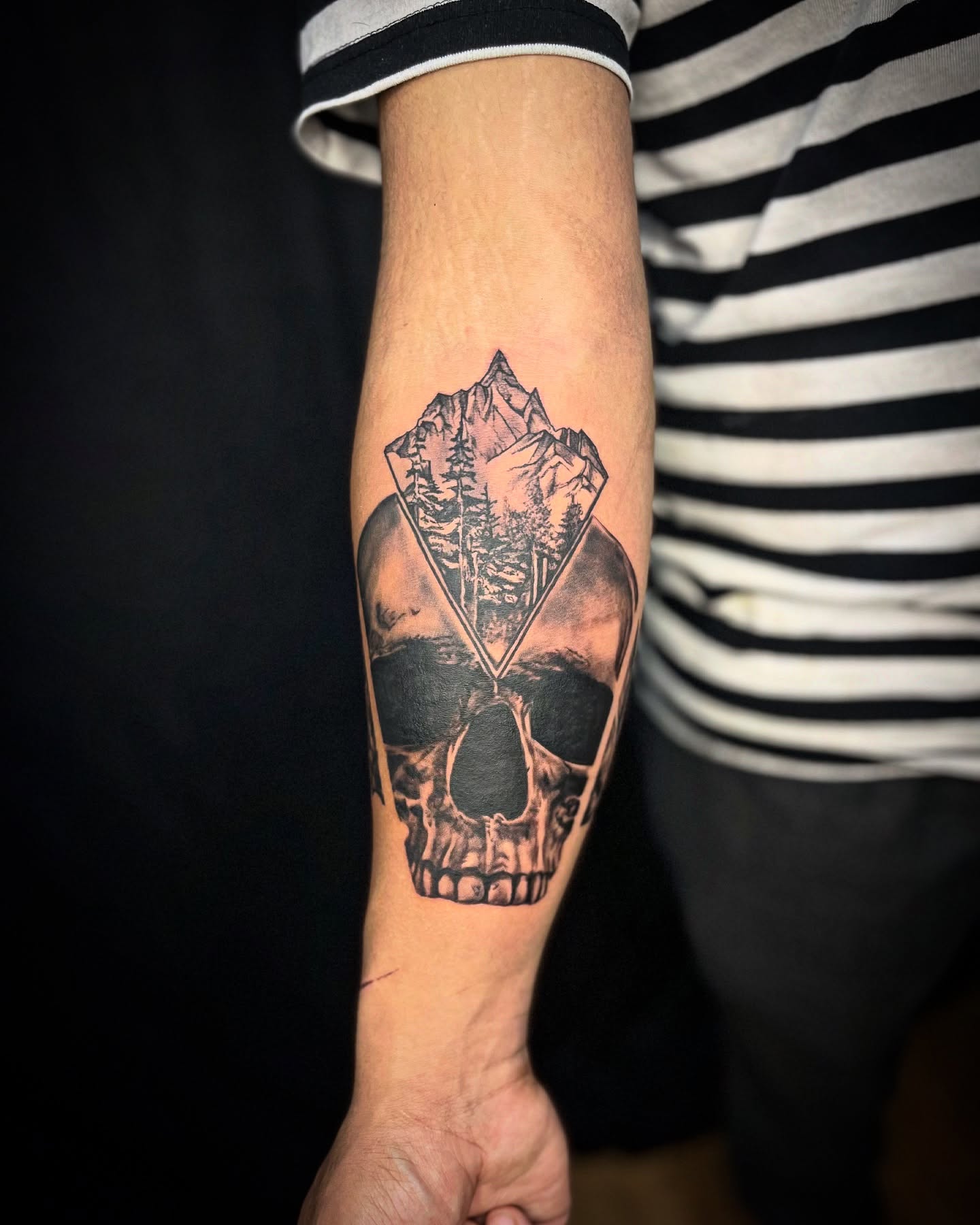 This tattoo features a striking design that combines a skull with a beautiful mountain landscape nestled inside it. The contrast between the dark skull and the detailed trees and peaks creates a fascinating visual story about life and nature. For those considering unique skull tattoos, think about how personal elements like nature can add even more meaning to your design.
