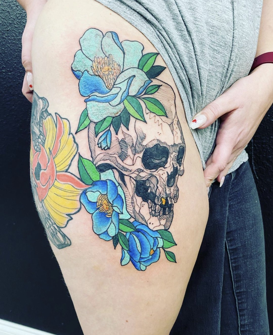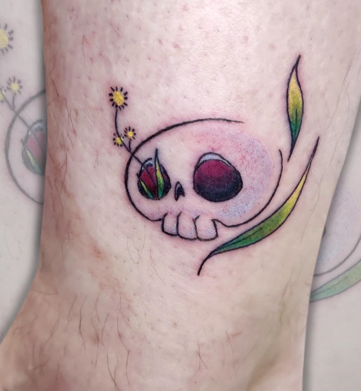 This tattoo showcases a charming skull intertwined with colorful flowers, creating a unique blend of life and death. The playful design highlights the contrast between the skull’s structure and the vibrant blooms, inviting viewers to appreciate the beauty in both. For those considering a similar tattoo, think about how personal elements can be woven into the design for a more meaningful piece.