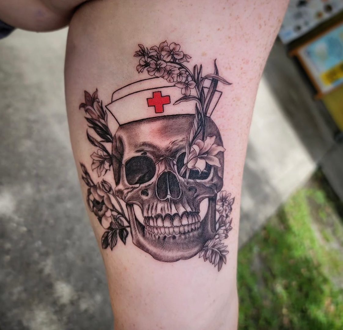 This tattoo stands out with its unique combination of a skull adorned with a nurse’s cap and delicate flowers. The vibrant details not only celebrate the medical profession but also add a touch of beauty and life to the design. For those considering a similar tattoo, think about incorporating elements that reflect your passions or profession for a more personal touch.