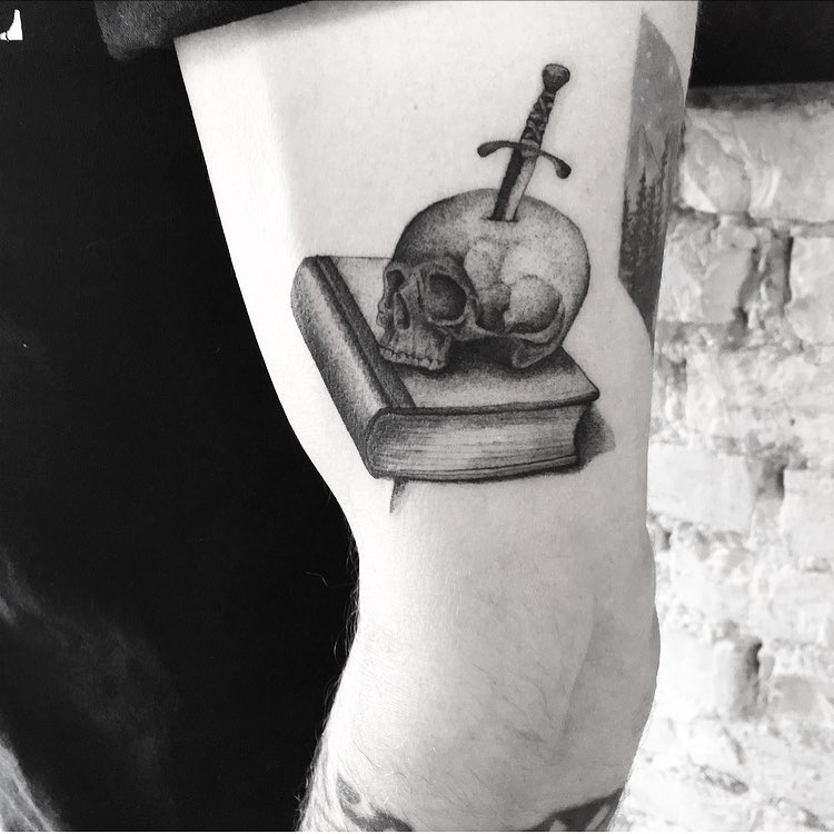 This tattoo features a striking design of a skull resting atop a book, with a sword piercing through it. The combination of elements invites viewers to ponder themes of knowledge and mortality. For those considering a similar design, think about how personal symbols can make your tattoo even more meaningful.