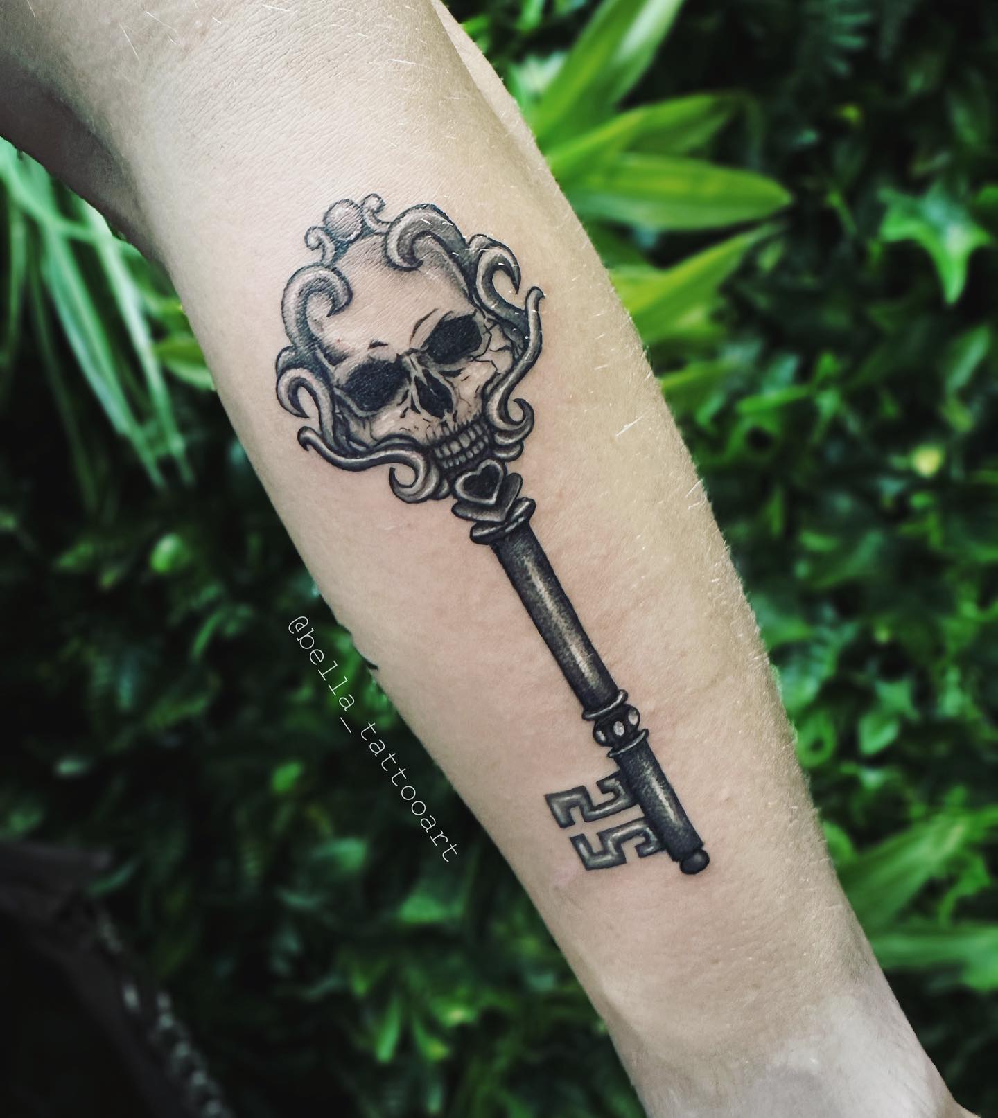This tattoo stands out with its creative design of a skull integrated into an elegant key. The intricate details and bold lines create a striking visual that sparks curiosity about its meaning. For those considering similar designs, think about personal symbols that hold special significance, making your tattoo even more meaningful.