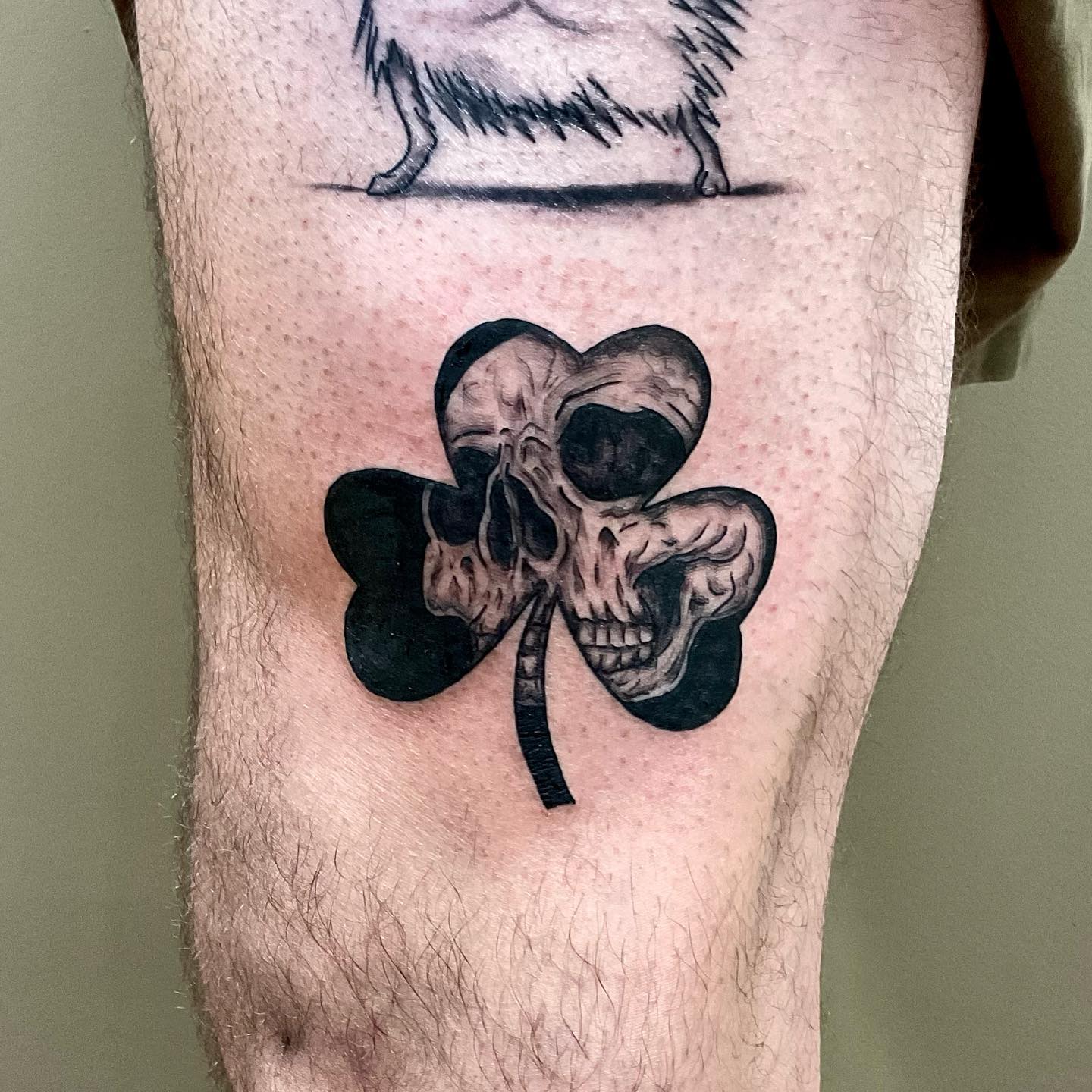 This striking tattoo beautifully combines a four-leaf clover with a skull, creating a unique blend of luck and mortality. The intricate details of the skull give it a captivating depth, making it a standout piece on the skin. When choosing a tattoo design, consider how elements like this can tell a personal story or represent your beliefs in an innovative way.