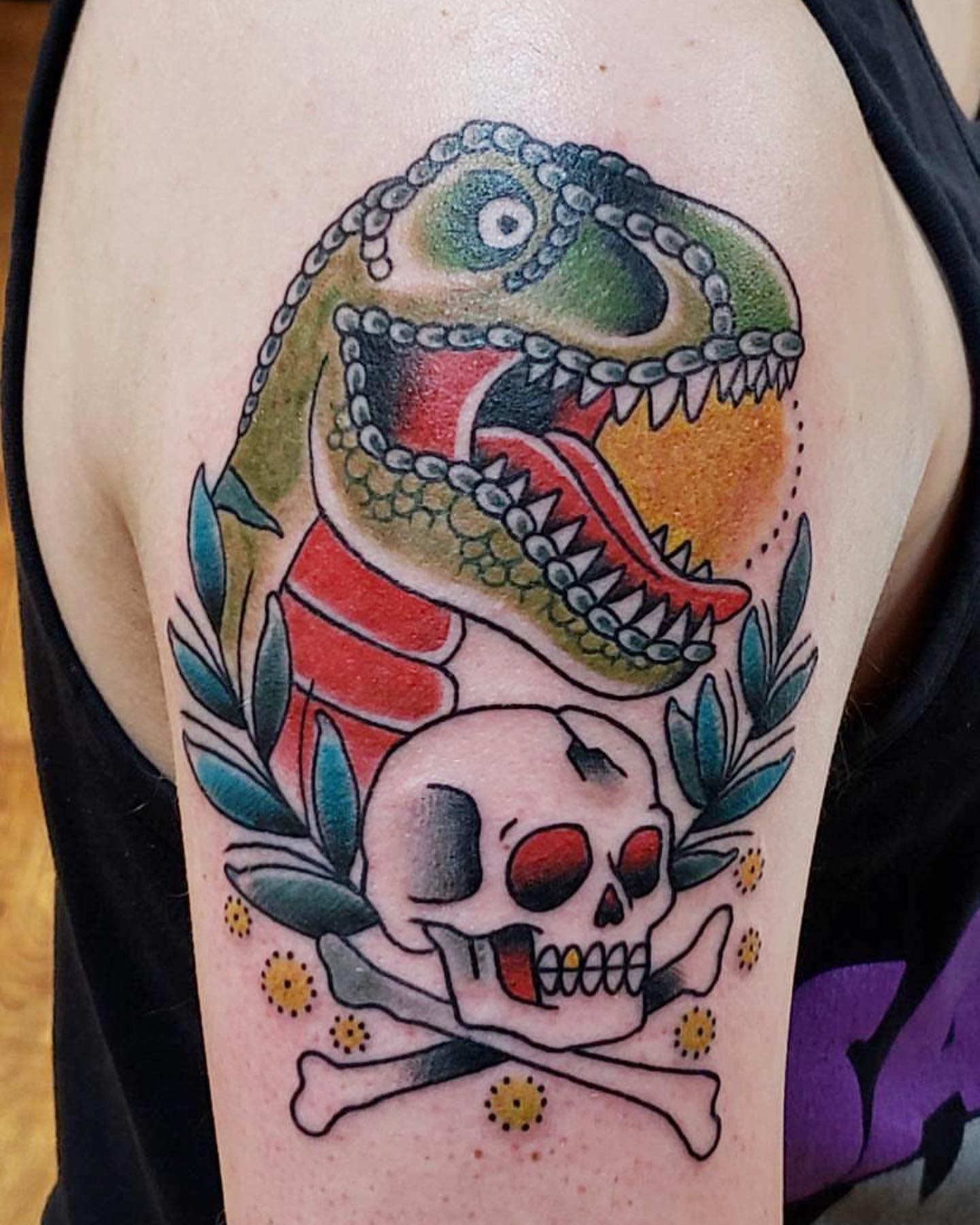 This tattoo stands out with a playful mix of a roaring dinosaur and a classic skull design, creating a fun story on skin. The vibrant colors and clever combination of elements make it a unique piece that catches the eye. For those considering a skull tattoo, think about adding personal touches that reflect your interests, just like this creative design!