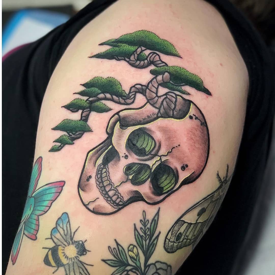 This tattoo features a striking skull intertwined with vibrant green trees, creating a beautiful harmony between life and death. The artist cleverly blends elements of nature, making the design both eye-catching and thought-provoking. Choosing a unique skull tattoo like this can express individuality while showcasing creativity and appreciation for the natural world.