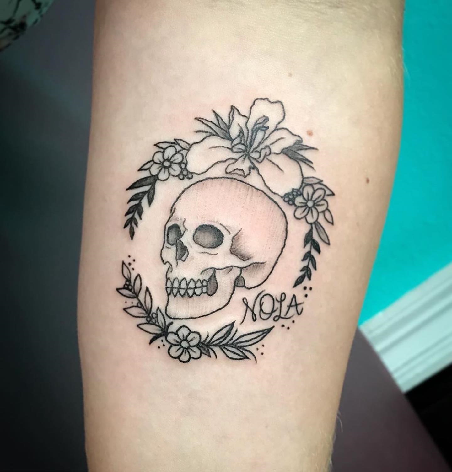 This tattoo features a beautifully crafted skull surrounded by delicate flowers and leaves, giving it a charming touch. The addition of the word “NOLA” hints at a connection to New Orleans culture, known for its vibrant art and music scene. For those considering a similar design, incorporating personal elements can make the tattoo even more meaningful.