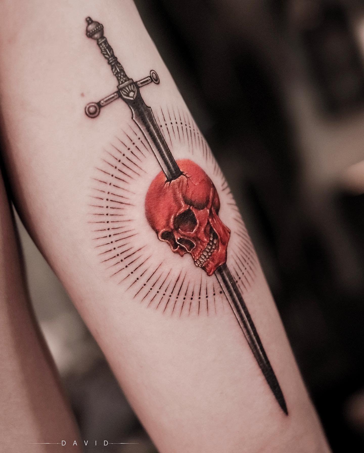 This tattoo features a striking red skull pierced by a sleek sword, creating a powerful visual impact. The rays of light radiating from the skull add a dramatic flair, making it stand out in any crowd. For those considering unique designs, combining elements like swords and skulls can tell a compelling story and express personal strength.