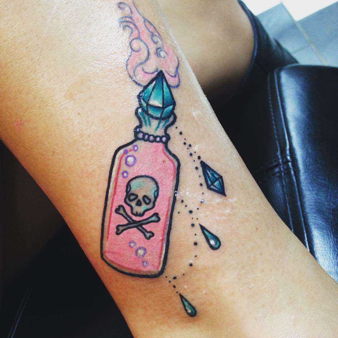 This eye-catching tattoo features a playful pink potion bottle adorned with a charming skull and sparkling gemstones. The blend of vibrant colors and whimsical elements creates a delightful design that stands out on the skin. For those considering unique skull tattoos, choosing a theme that reflects personal interests can make the piece even more special.