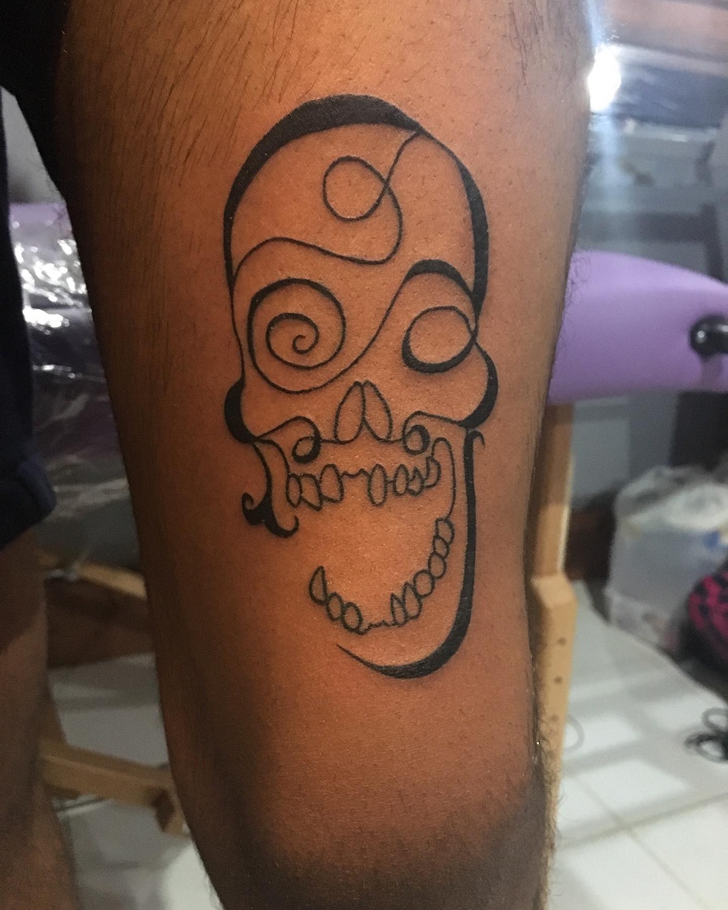 This tattoo stands out with its unique design featuring swirling lines that create an eye-catching skull. The smooth curves and bold outlines give it a modern twist, making it a fantastic conversation starter. For those considering a skull tattoo, think about adding personal elements that reflect your style!