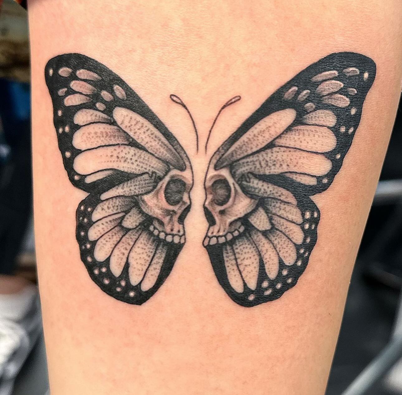 This tattoo uniquely blends the beauty of a butterfly with the intrigue of skulls, creating a striking visual. The detailed artistry showcases the delicate wings alongside the somber elements, making it both enchanting and thought-provoking. For those considering a tattoo, pairing contrasting themes can lead to a truly memorable piece.