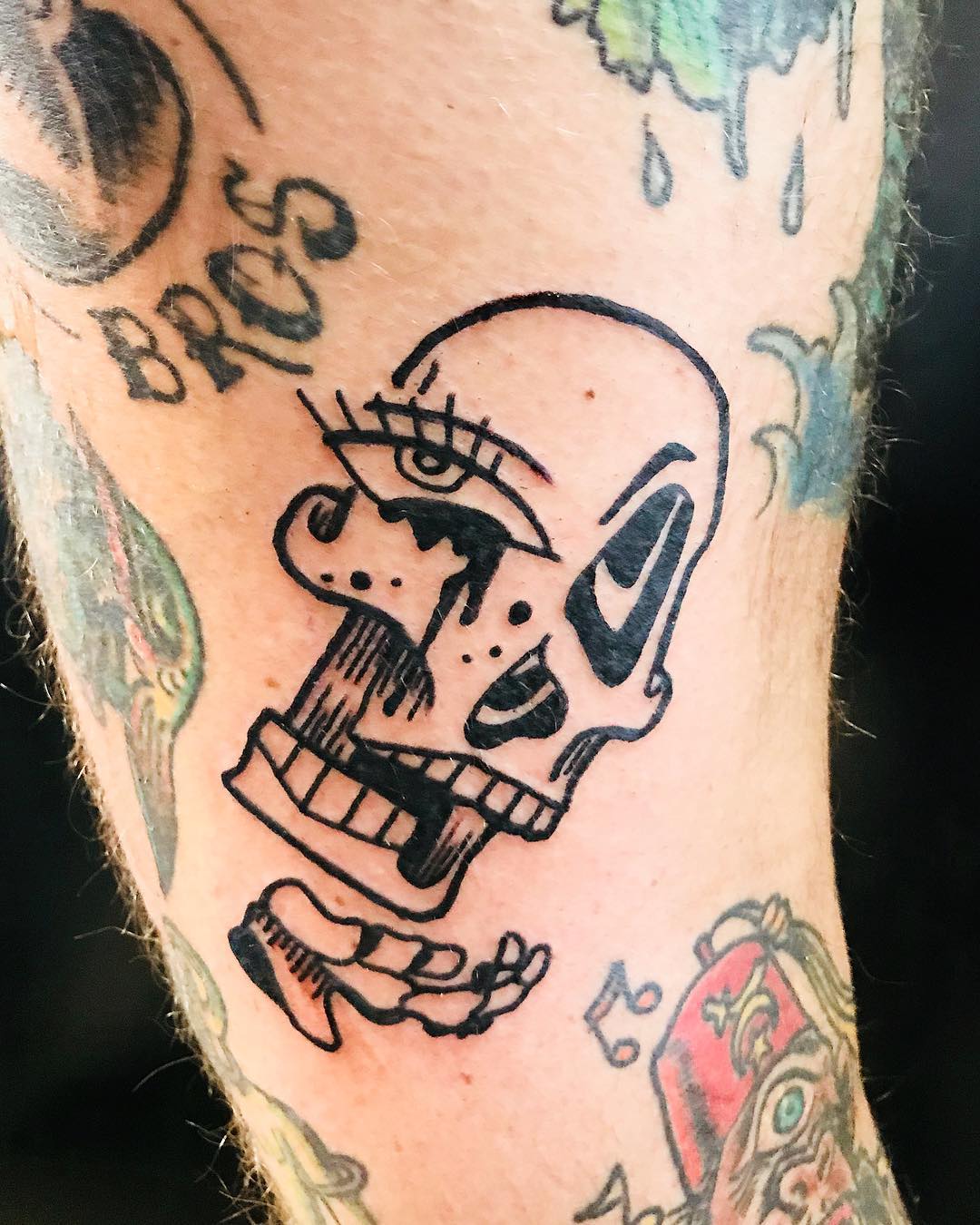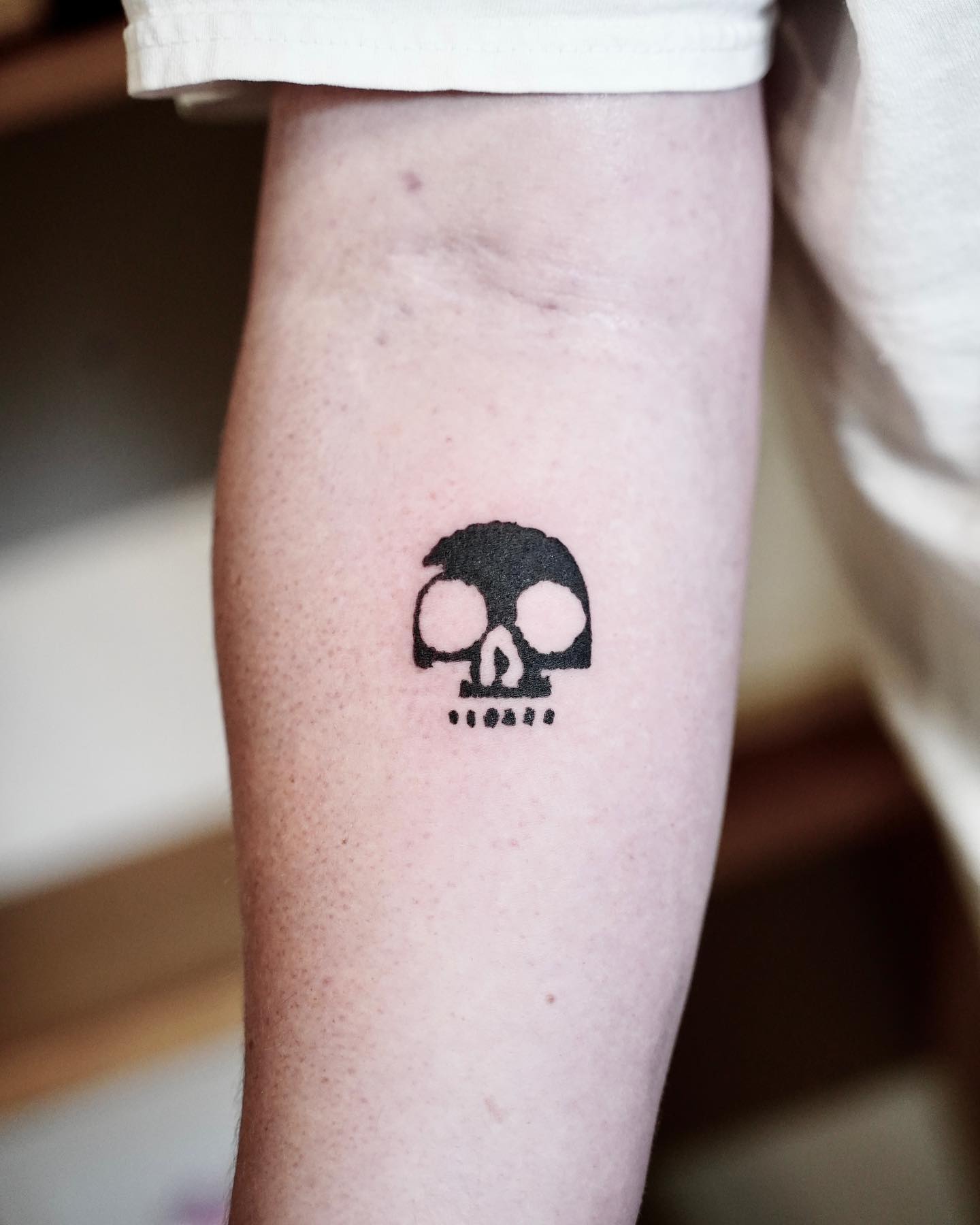 This tattoo features a simple yet eye-catching skull with bold lines and playful details. Its minimalist style makes it stand out, appealing to those who prefer understated art. For anyone considering a unique skull tattoo, opting for a clean design can be a fantastic way to express personality without overwhelming the viewer.