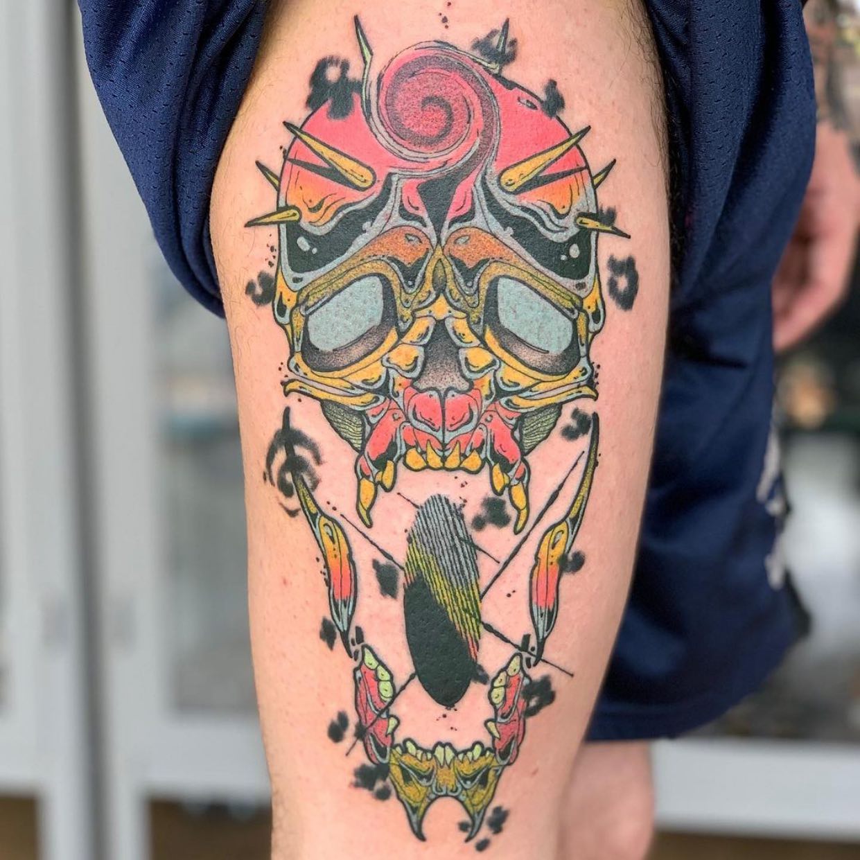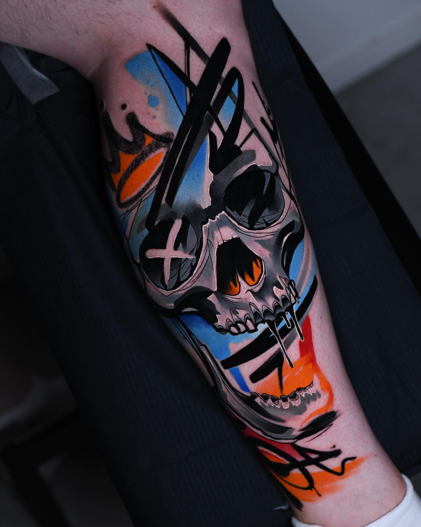 This tattoo stands out with its vibrant colors and bold design, making it a true eye-catcher. The unique blend of artistic elements, including splashes of blue and orange, brings the skull to life in a way that feels both modern and creative. When considering a tattoo, exploring different styles can lead to discovering something truly personal and expressive.