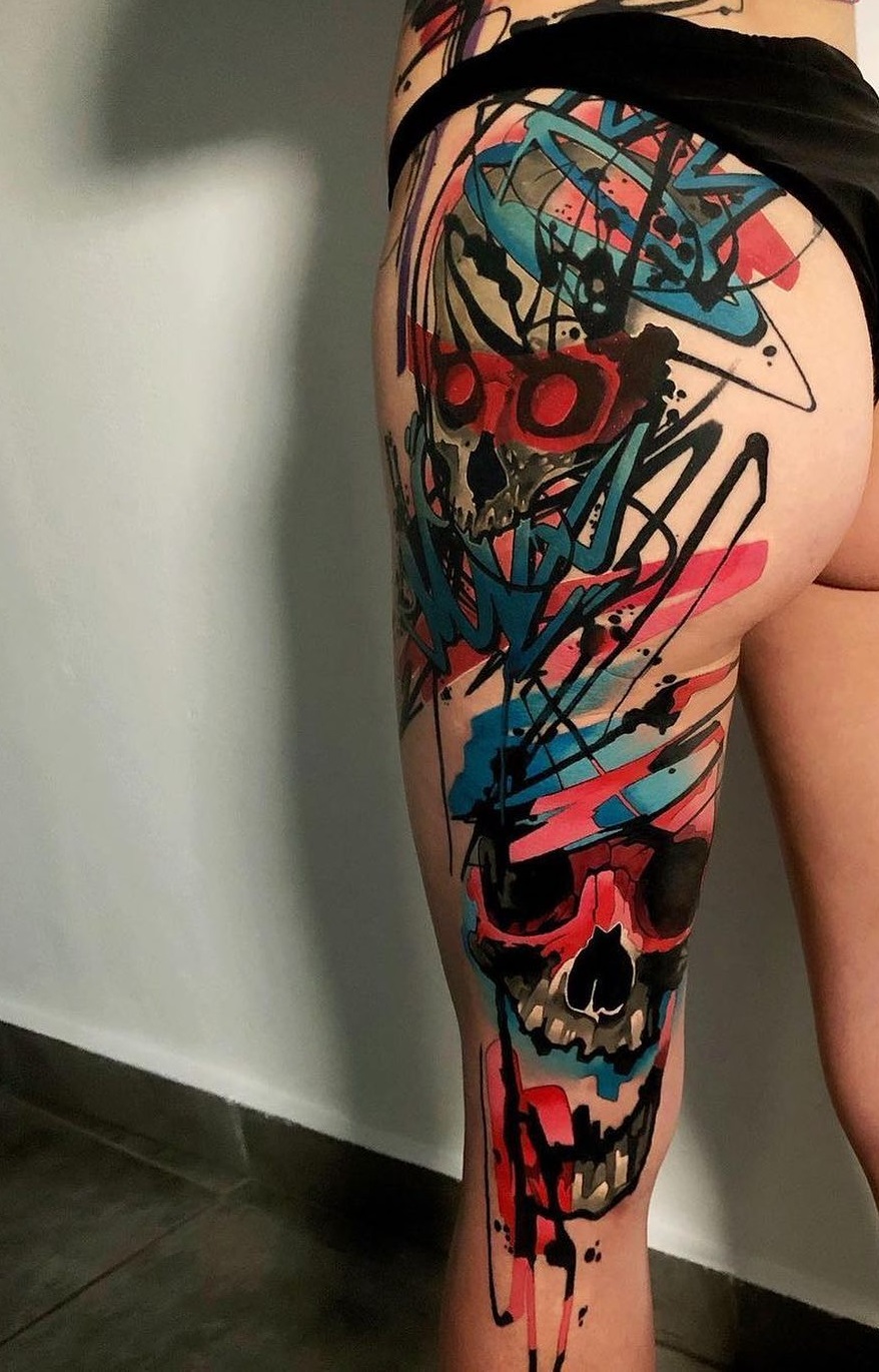 This tattoo showcases a vibrant blend of colors and unique skull designs that catch the eye instantly. The mix of bold reds, blues, and dynamic shapes creates an energetic look that stands out on the skin. For those considering a similar design, choosing bright colors can add a fun twist to traditional skull tattoos.