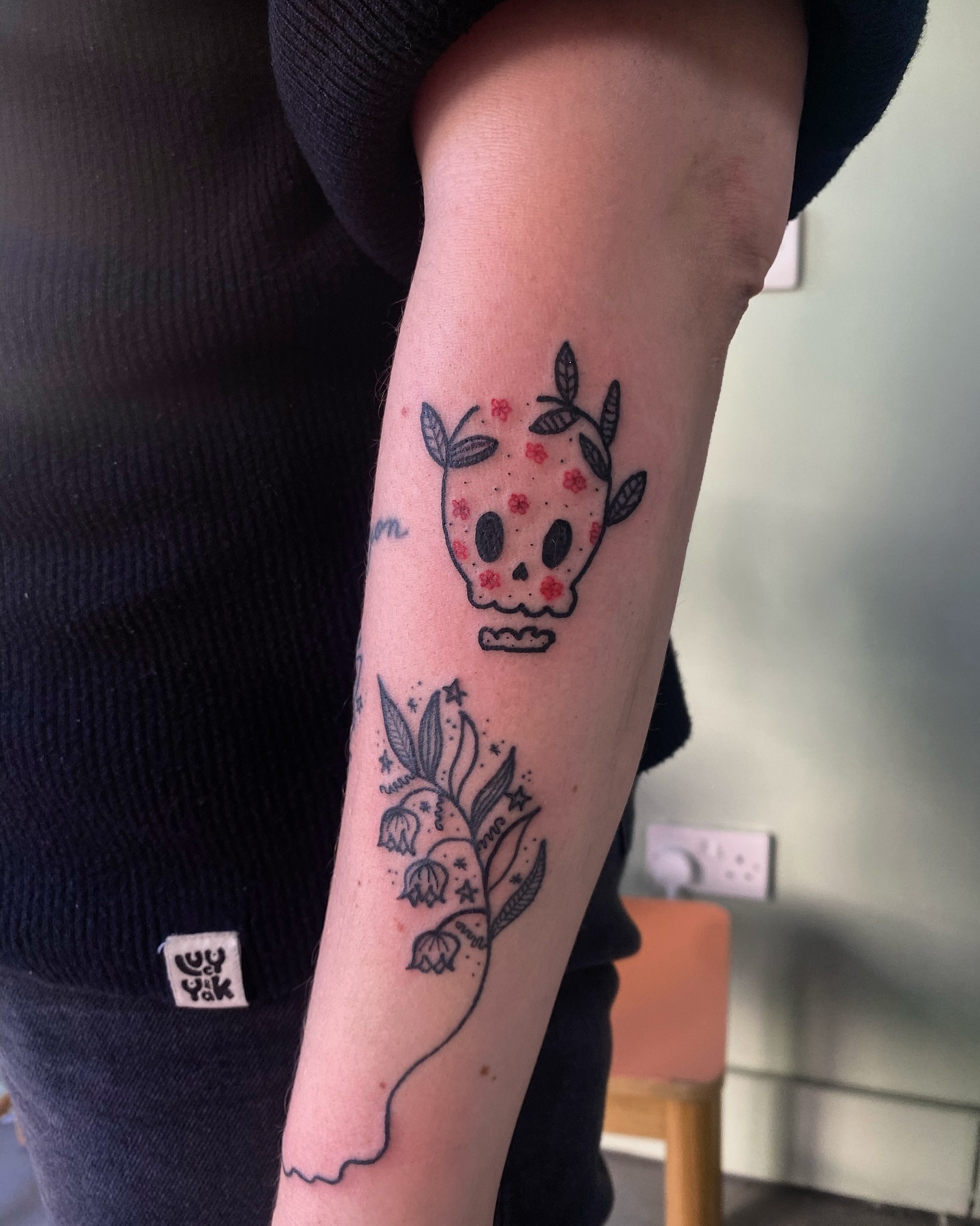 This tattoo stands out with its blend of skull elements and whimsical design. The intricate details create a charming fusion of life and death, inviting viewers to explore the deeper meaning behind the art. For those considering unique skull tattoos, think about how personal symbols can transform a design into a story that resonates with you.