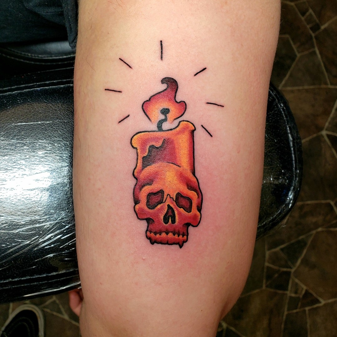 This tattoo features a striking blend of a skull and a candle, creating a unique twist on traditional skull art. The vibrant colors and playful flame add a sense of life to the design, making it both eye-catching and thought-provoking. A great tip for anyone considering a similar tattoo is to think about the personal meaning behind the imagery, as it can make the piece even more special.