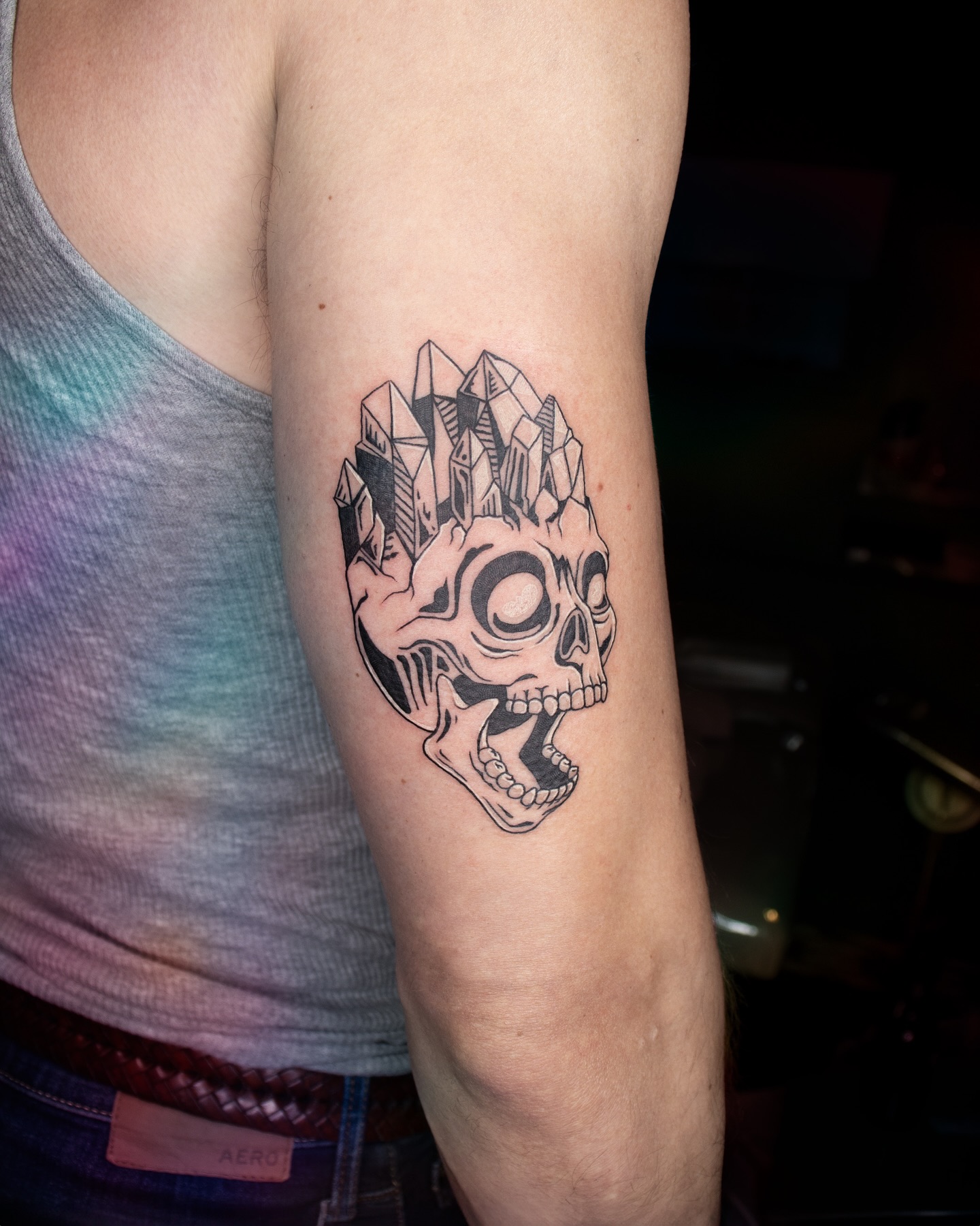 This tattoo stands out with its striking design of a skull topped with sharp, angular crystals. The combination of the skull’s fierce expression and the intricate details of the crystals creates a sense of energy and boldness. For those considering a unique skull tattoo, think about how elements like gemstones can add a personal touch to your design.