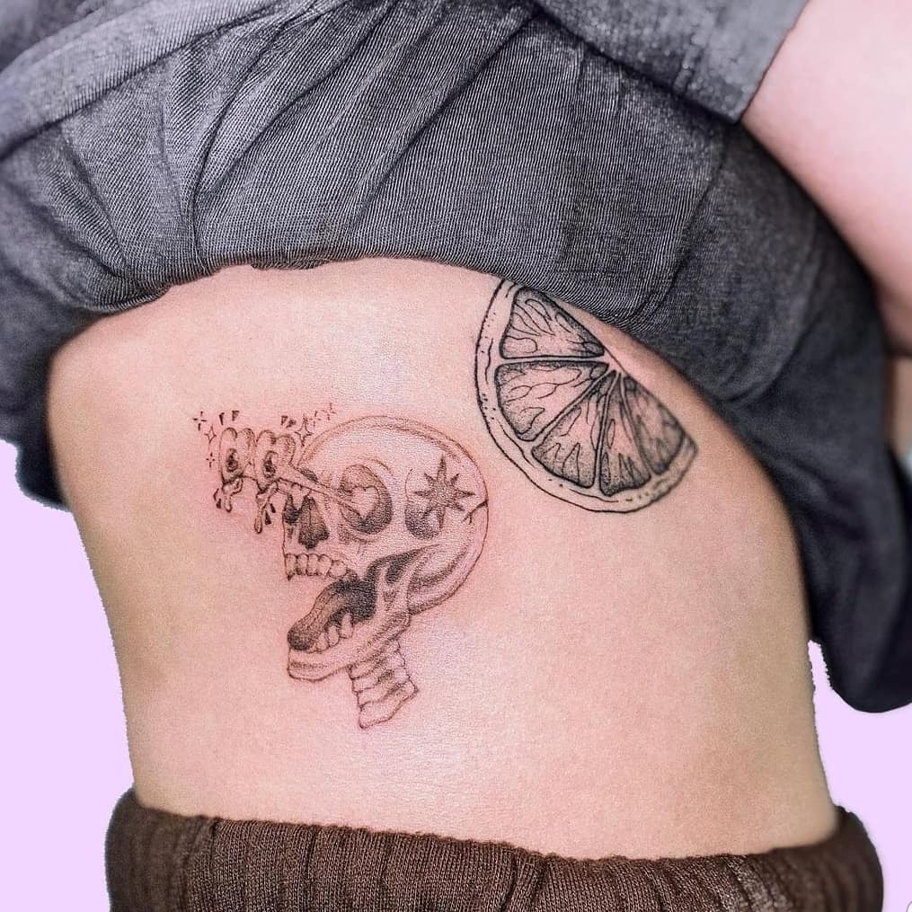 This tattoo combines a quirky skull with a playful lemon slice, making it truly one-of-a-kind. The skull s expressive features and the vibrant fruit create a lively contrast, showcasing a fun blend of themes. For those considering a tattoo, think about how combining elements can tell your unique story!