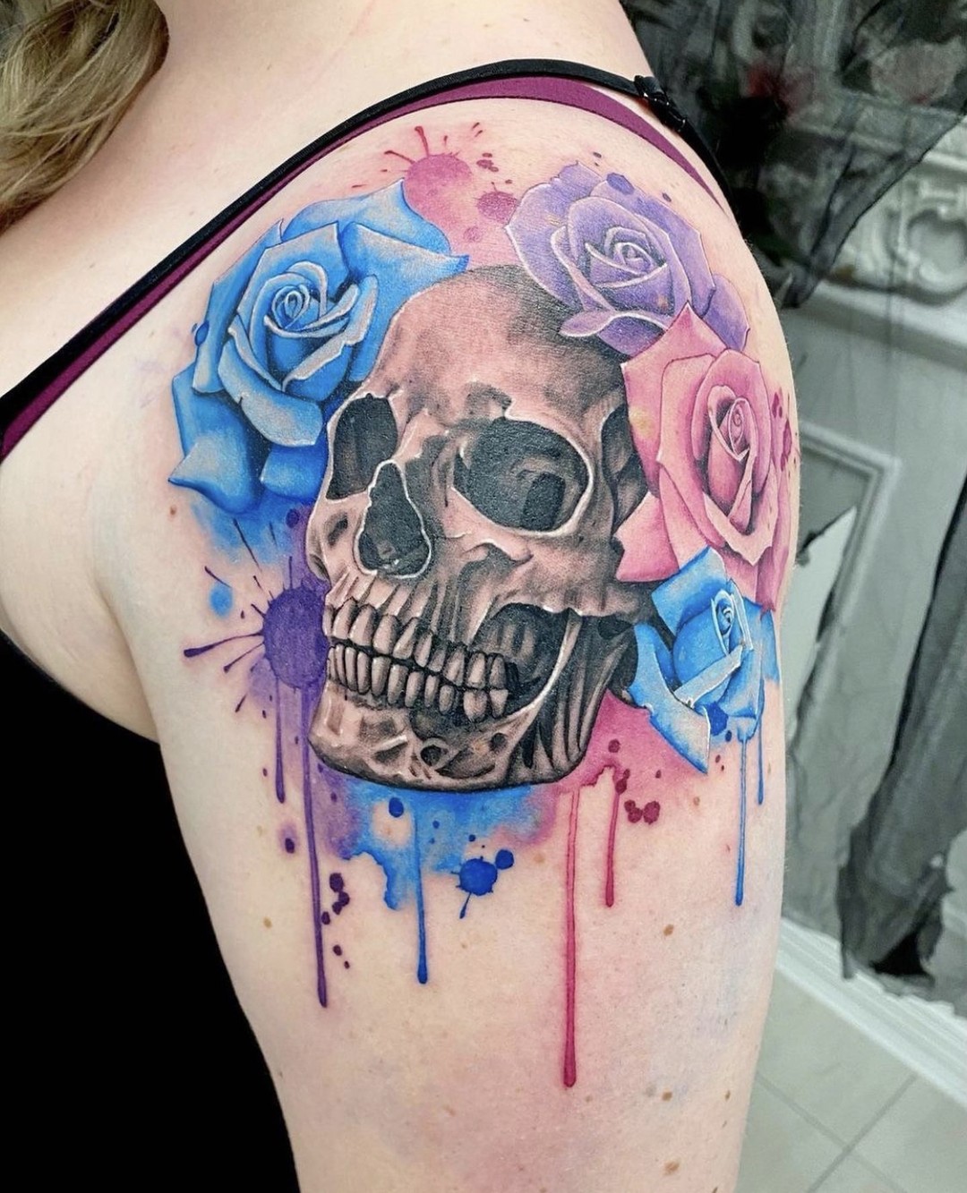This tattoo stands out with its vibrant colors and striking design, blending a detailed skull with beautiful blue and purple roses. The combination creates a captivating contrast that draws the eye and tells a story of life and death intertwined. For those considering a similar design, think about how colors can add depth and emotion to your artwork.