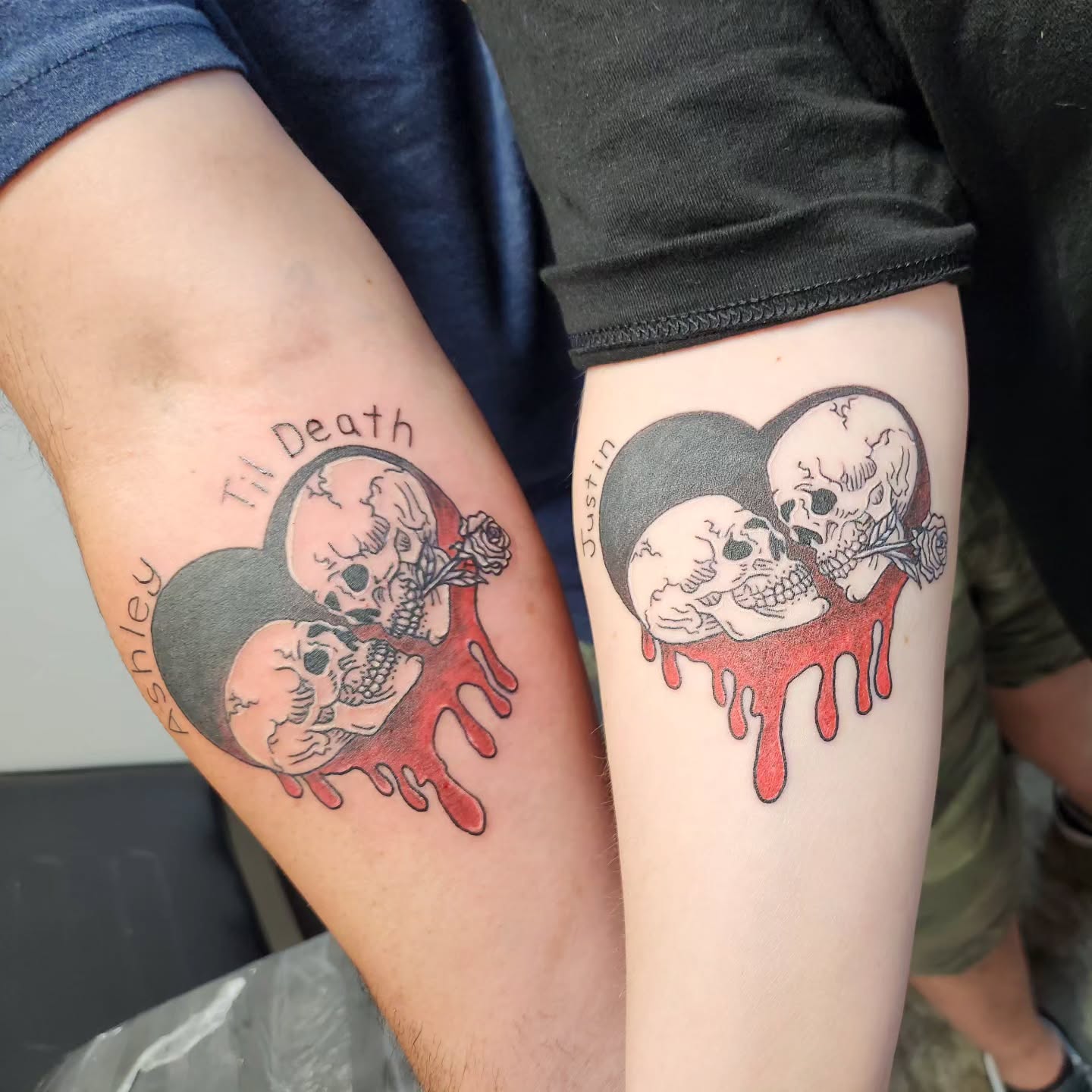 This striking tattoo design showcases two skulls intertwined in a heart, dripping with bold red details. It symbolizes a deep bond, highlighted by the phrases “Till Death” and names like Ashley and Justin, making it a truly personalized piece. Couples looking for a meaningful way to express their commitment might find inspiration in this captivating artwork.