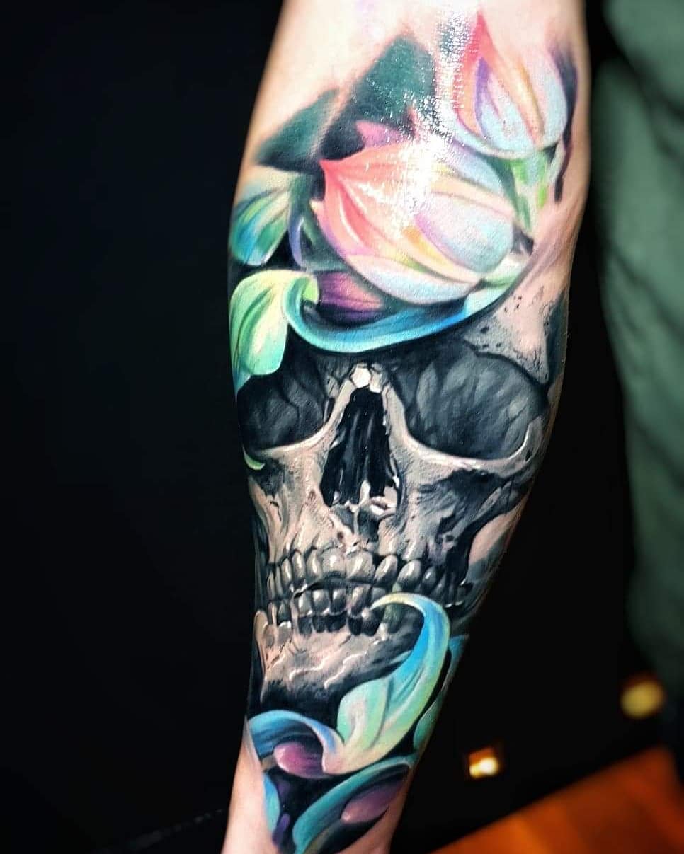 This tattoo stands out with its vibrant colors and striking design, creating a bold statement on the arm. The unique blend of shades gives the skull an eye-catching, almost animated appearance, making it a true conversation starter. For those considering similar artwork, choosing bright colors can enhance the overall impact and personality of the tattoo.