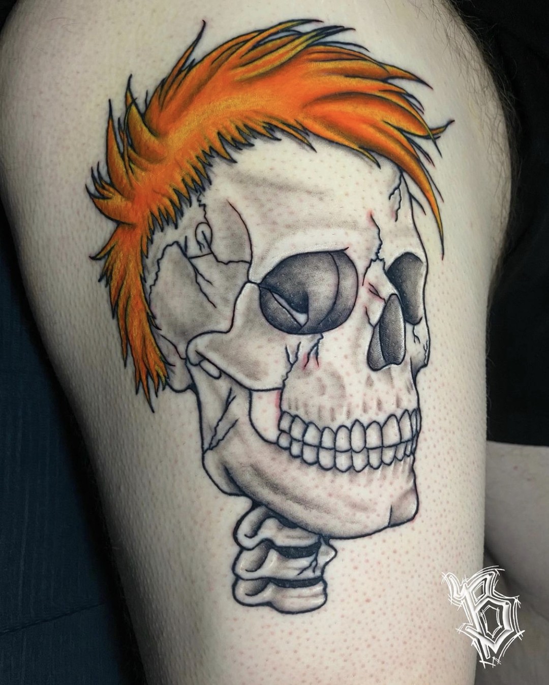 This tattoo stands out with its striking orange hair atop a skull, blending a playful vibe with a classic design. The artist skillfully captures the skull’s details while adding a unique flair that makes it memorable. For those considering a tattoo, think about how personal elements can transform traditional designs into something truly special.