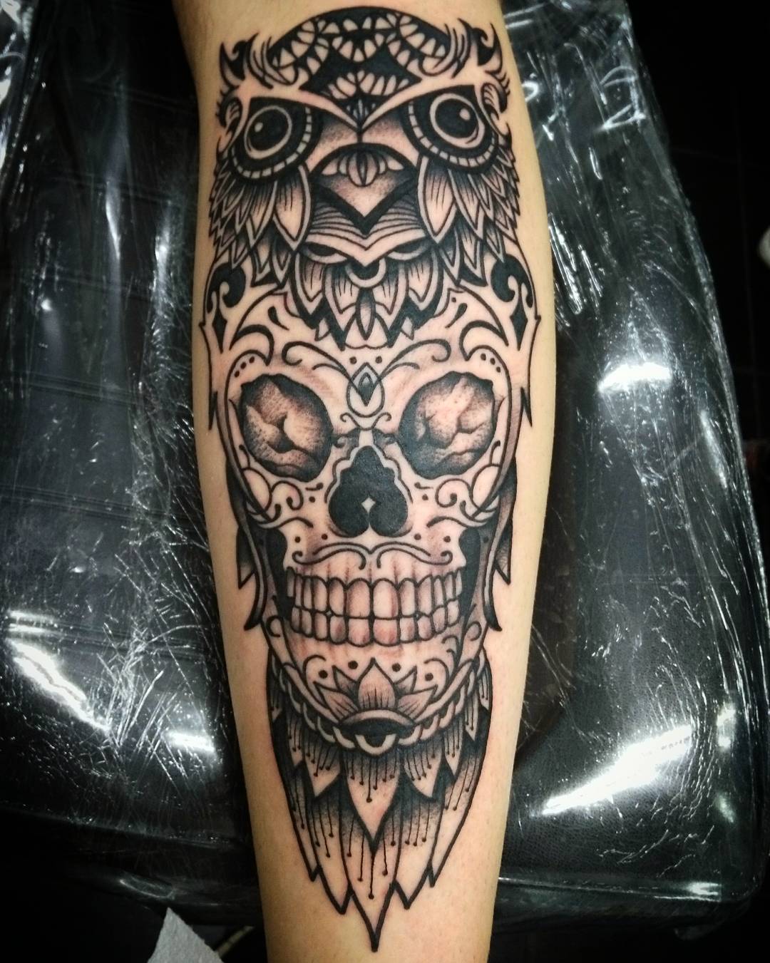 This tattoo stands out with its intricate blend of a skull and an owl, showcasing stunning detail. The combination symbolizes wisdom and mortality, making it a thought-provoking piece of art. For those considering a unique skull tattoo, think about how personal symbols can add deeper meaning to your design.