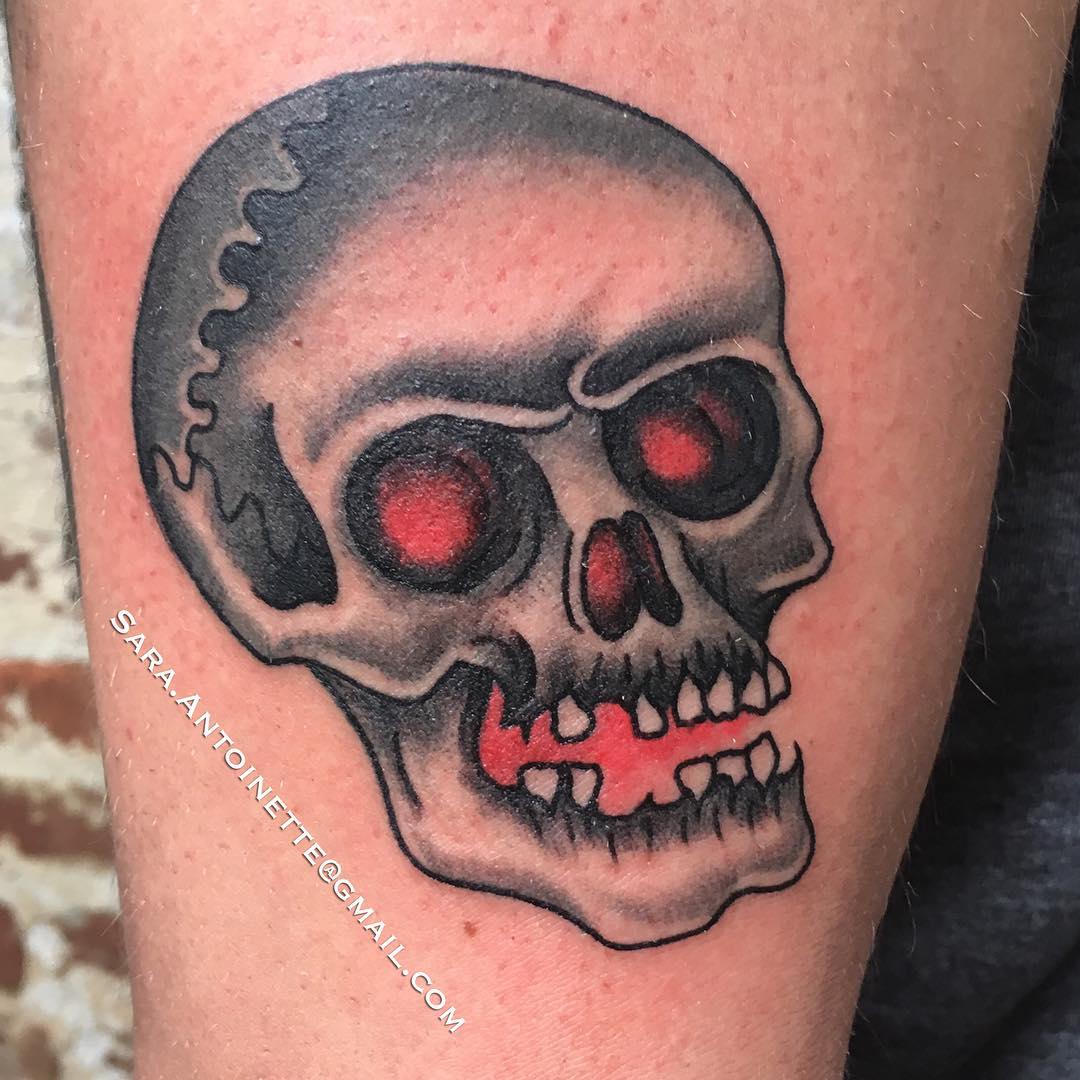 This tattoo stands out with its playful blend of a skull and a whimsical eye, creating a charming visual. The unique style combines elements of traditional tattoo art with a modern twist, making it truly eye-catching. For those considering a skull tattoo, think about adding personal details to make it even more special.