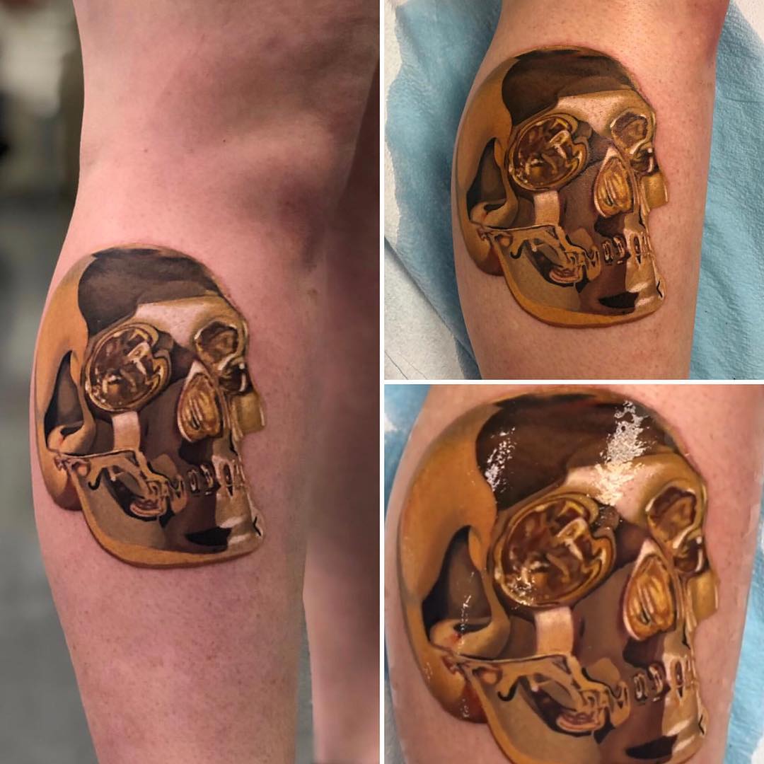 This tattoo stands out with its stunning golden hues and remarkable detail, making it look almost three-dimensional. The blend of colors creates a striking effect, drawing attention and sparking curiosity. For those considering unique skull tattoos, choosing a design with depth can really elevate the overall impact.