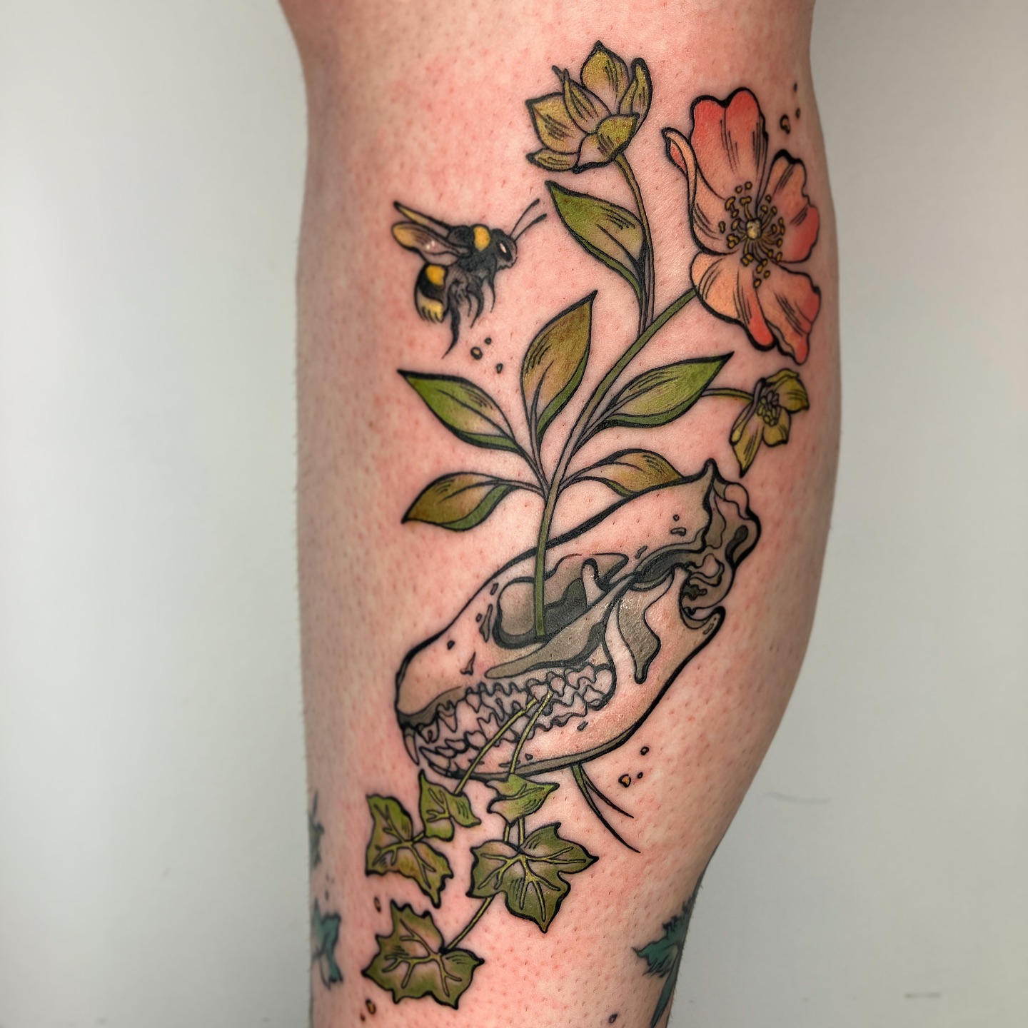 This tattoo stands out with its unique blend of a skull and vibrant flowers intertwining beautifully. The delicate plants seem to breathe life into the skull, illustrating the balance between nature and mortality. Choosing a design that combines elements like this can create a powerful statement about life and transformation.