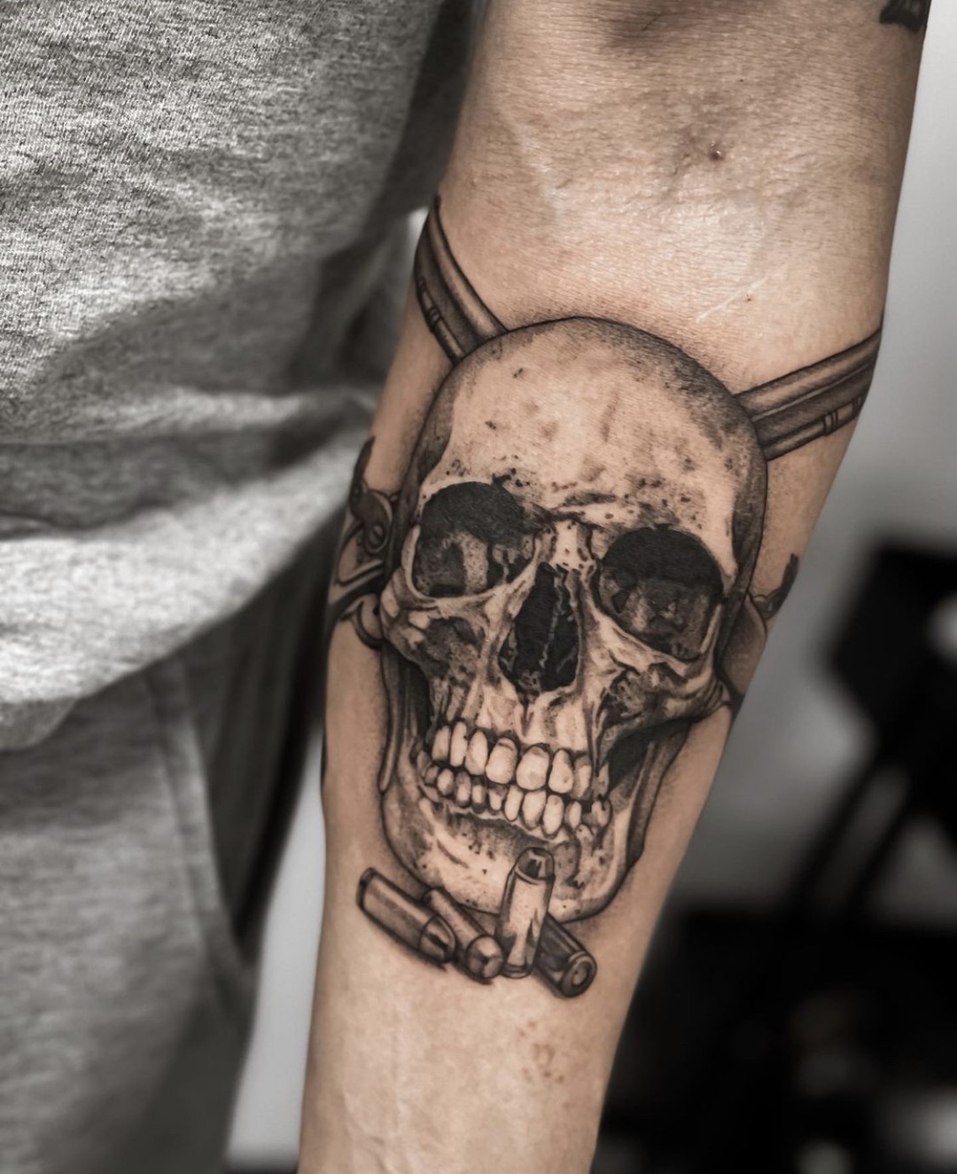 This striking tattoo features a skull adorned with bullets, creating a powerful and edgy look. The intricate details and shading bring the design to life, making it a standout choice for those who appreciate bold artwork. When choosing a tattoo, consider how the design reflects personal experiences or beliefs for a more meaningful connection.