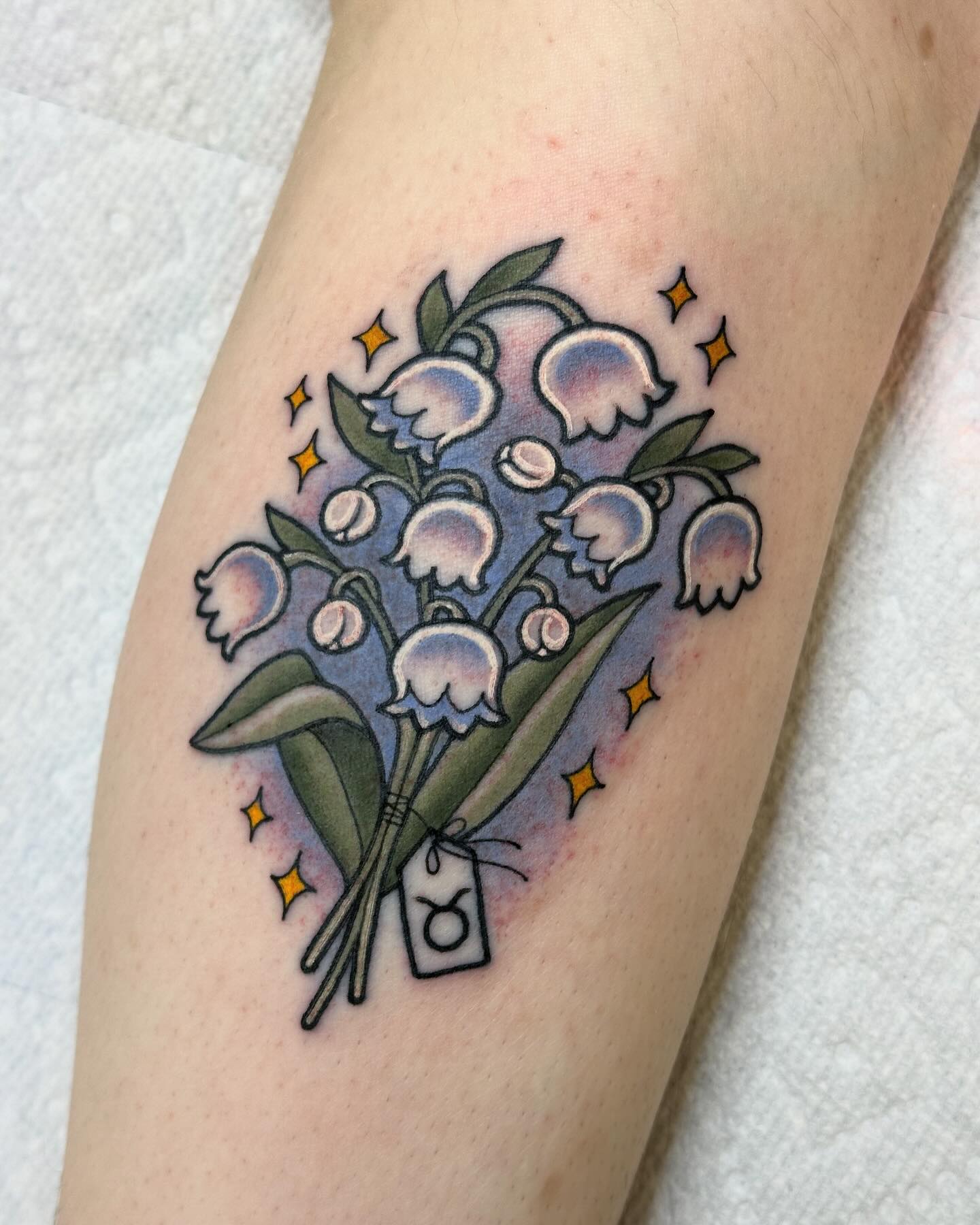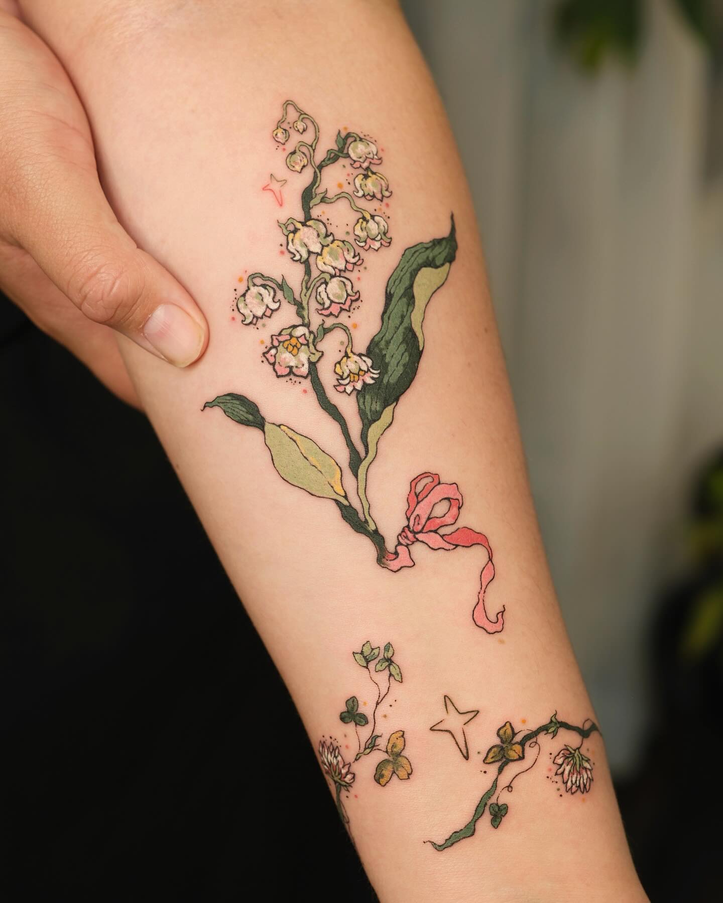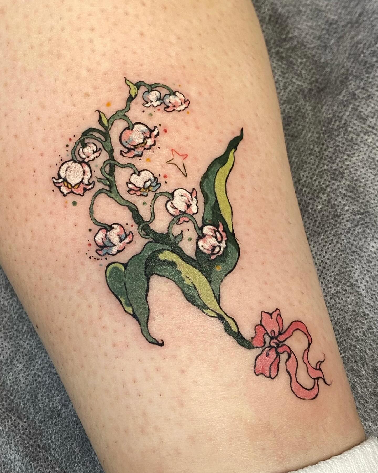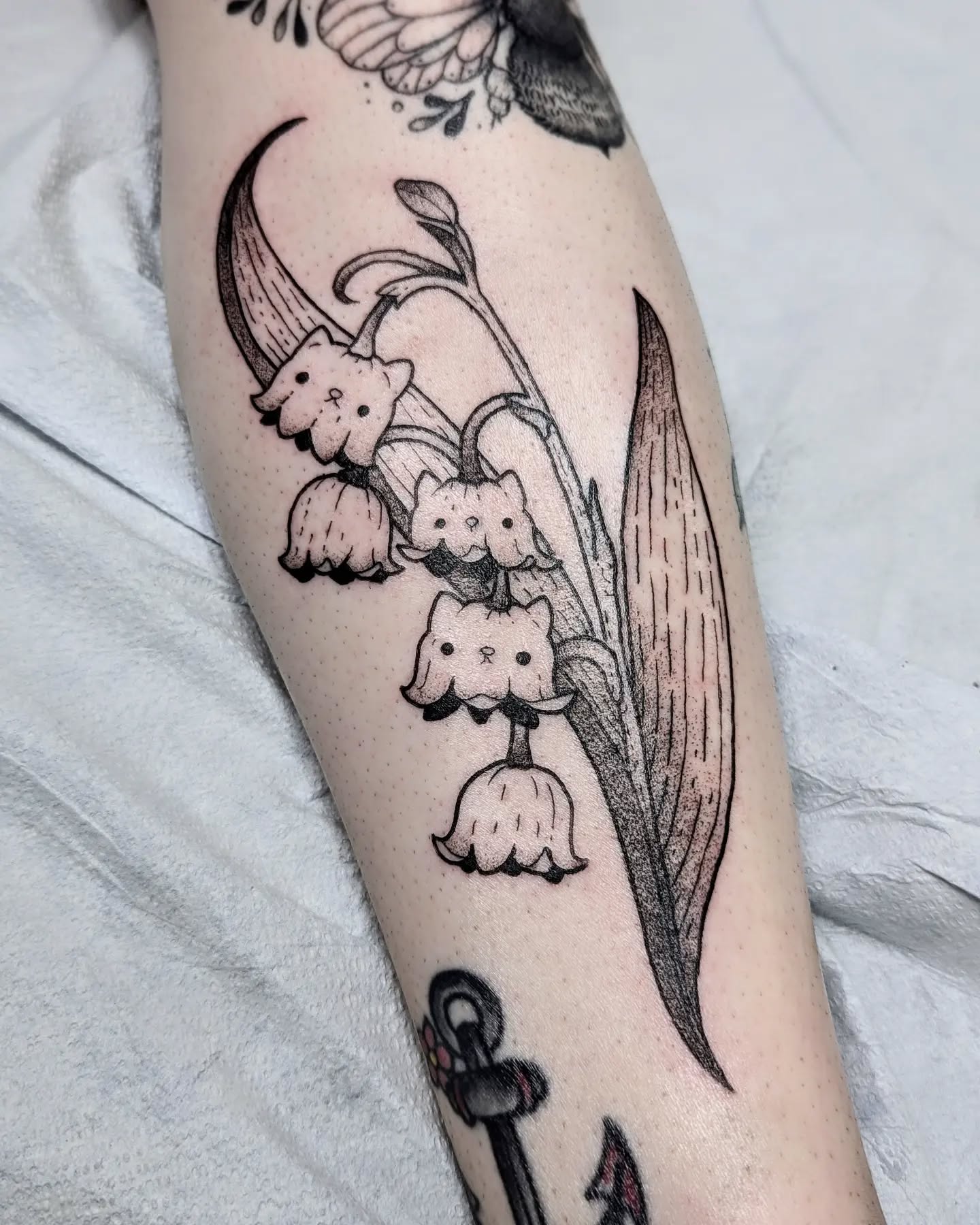 The tattoo features a charming arrangement of Lily of the Valley flowers with playful, cartoon-like details.