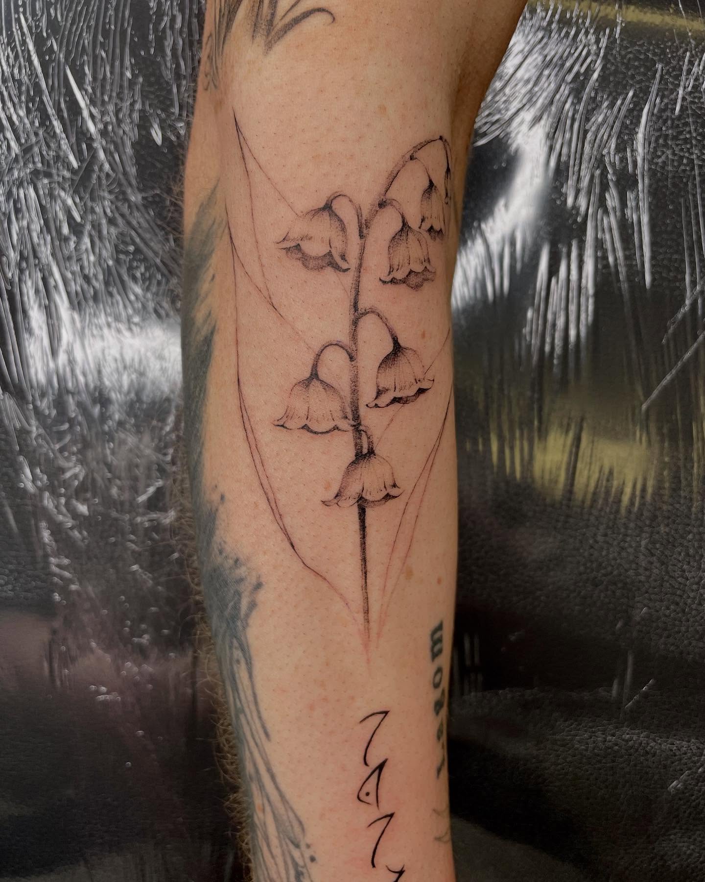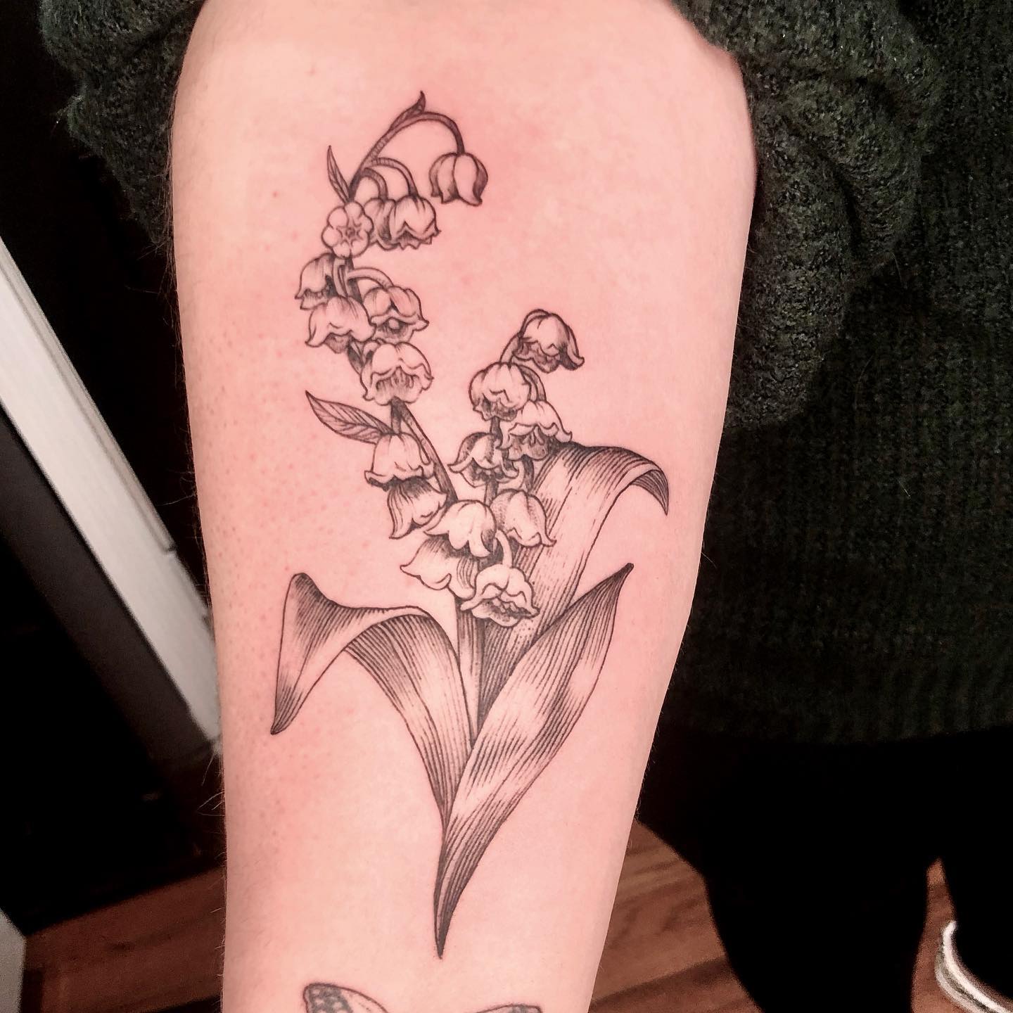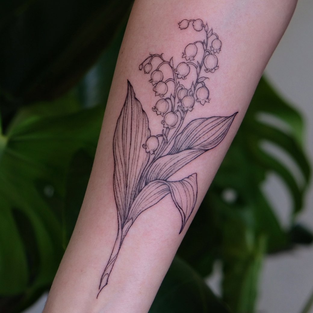 The tattoo features a delicate line drawing of Lily of the Valley flowers, emphasizing their unique bell-shaped blooms.
