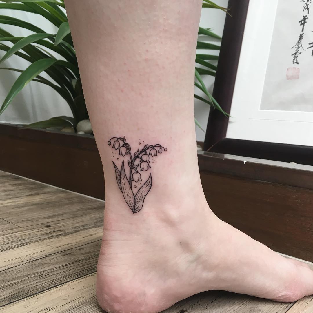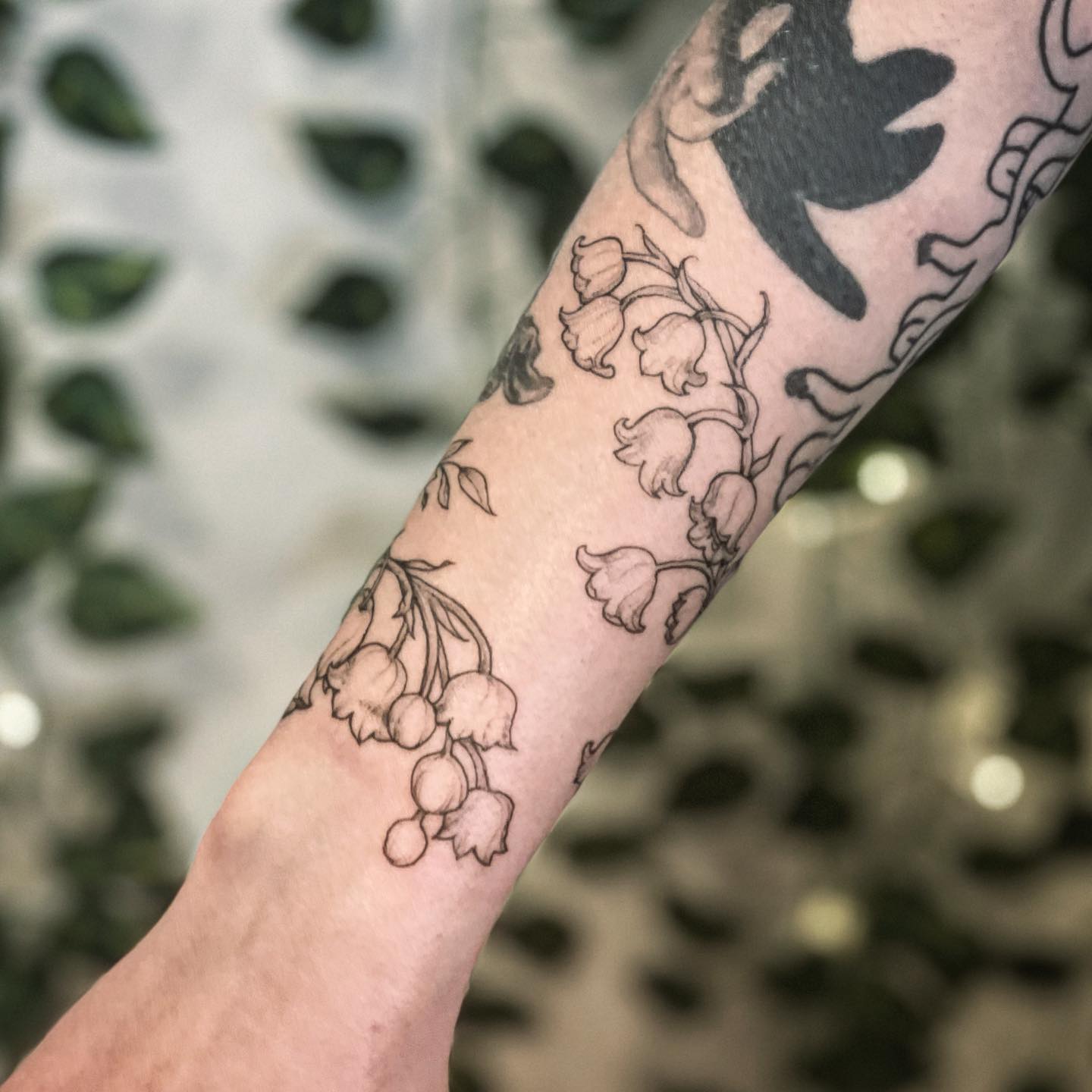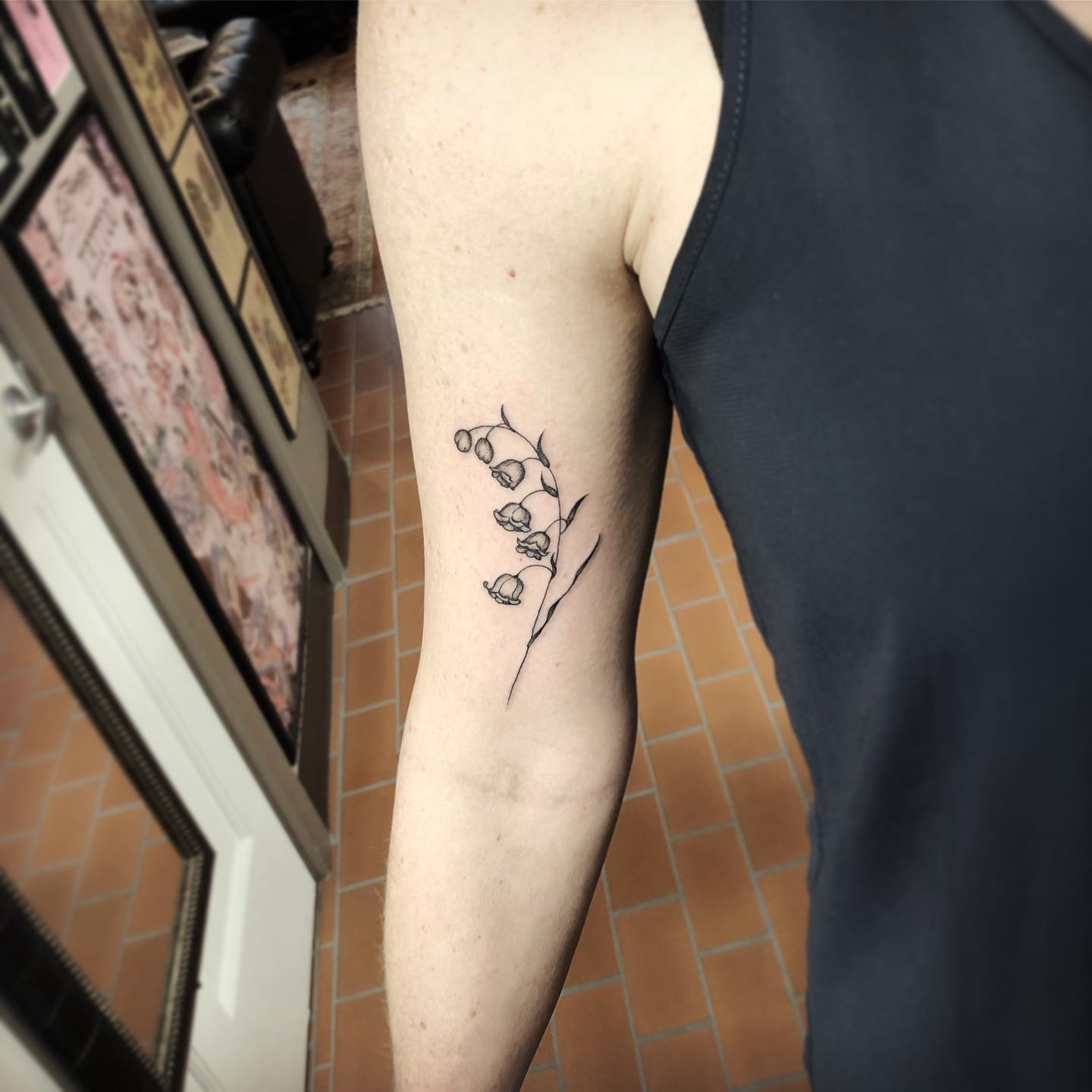 The tattoo features a delicate line drawing of Lily of the Valley flowers, emphasizing their unique bell-shaped blooms.