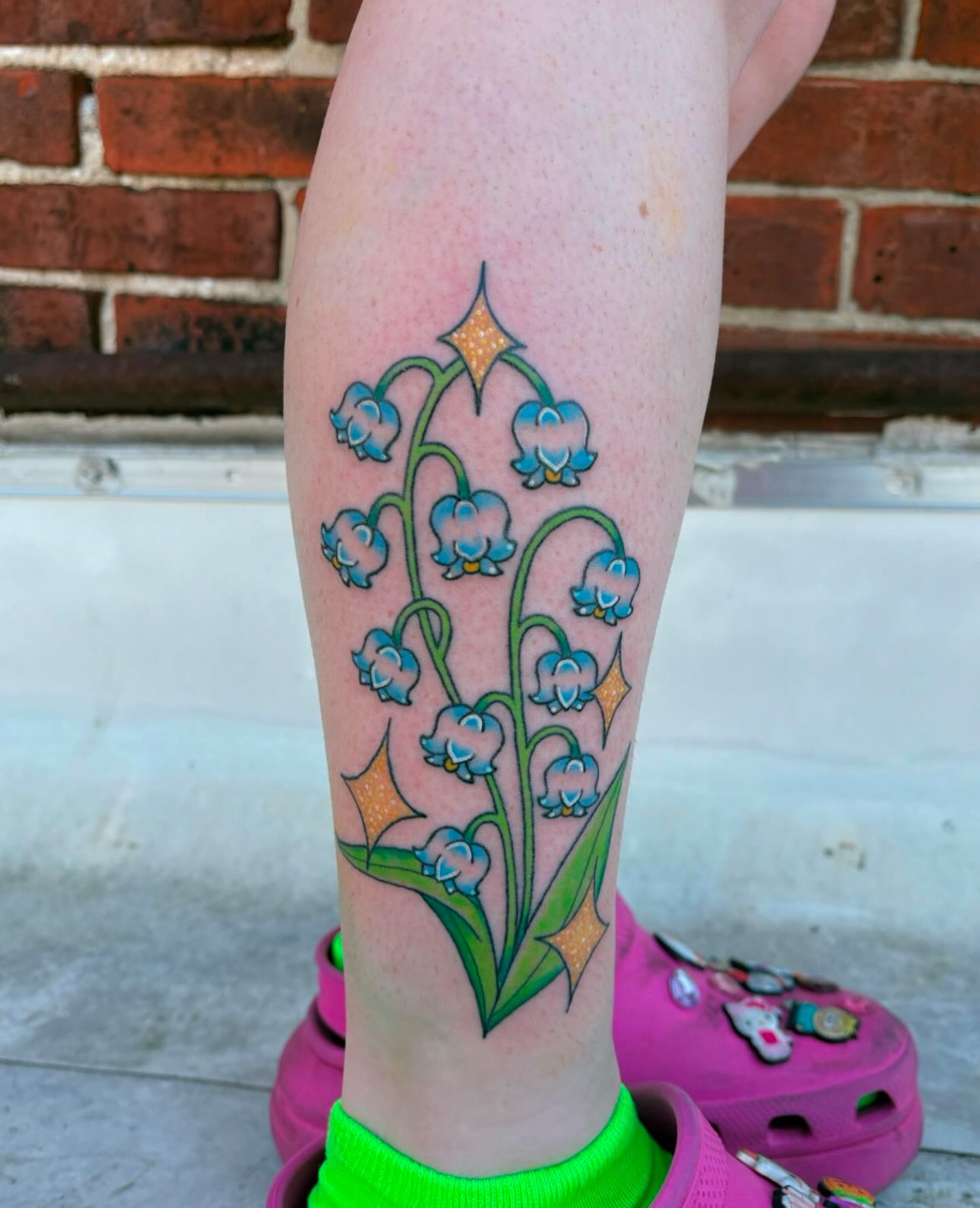The tattoo showcases a bright arrangement of Lily of the Valley flowers, each intricately detailed with rich blue tones and delicate outlines.