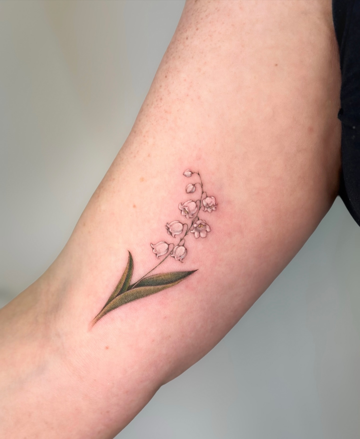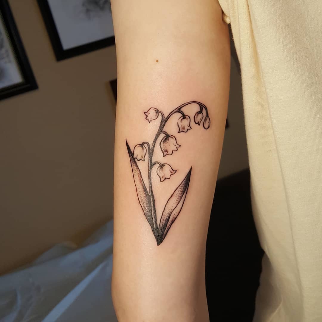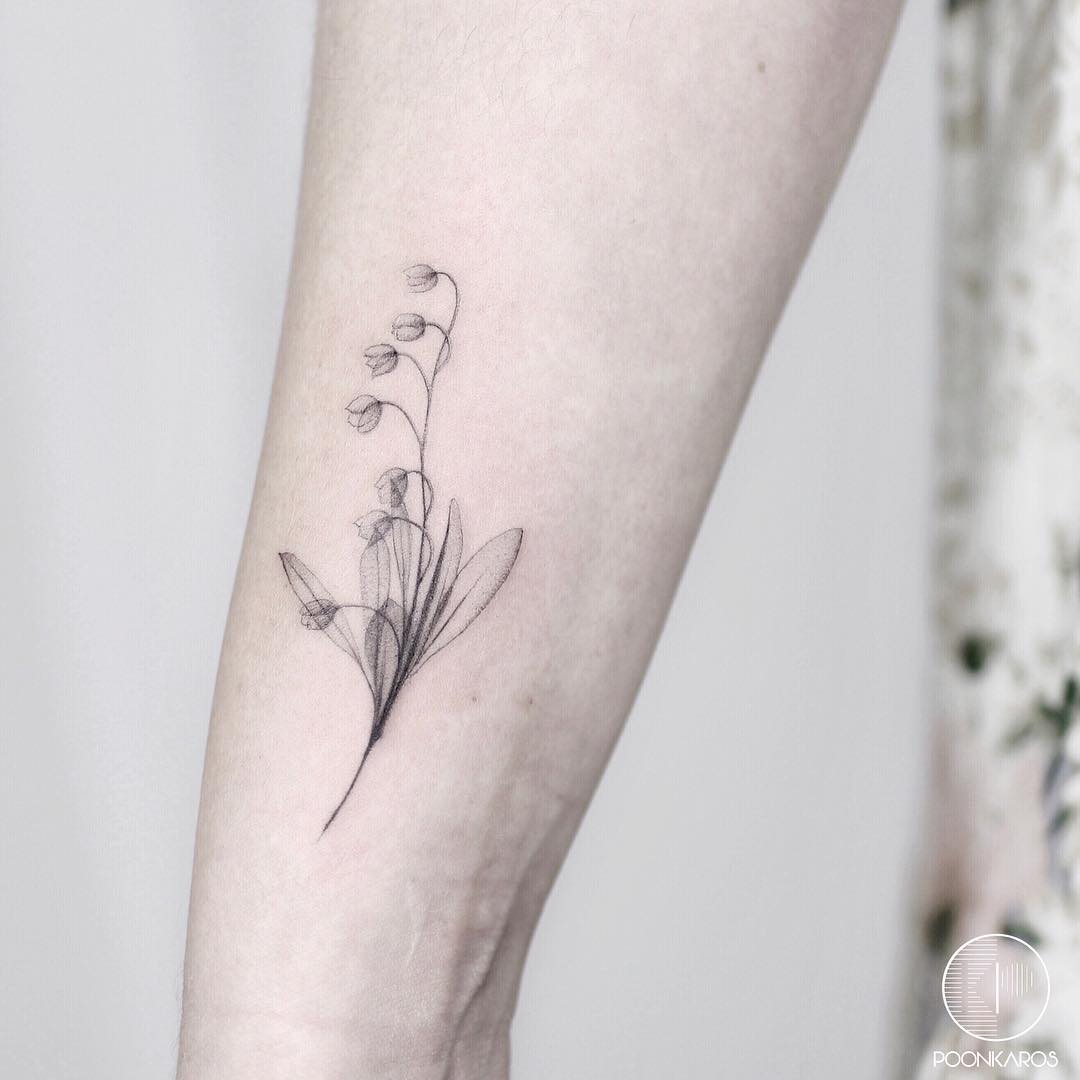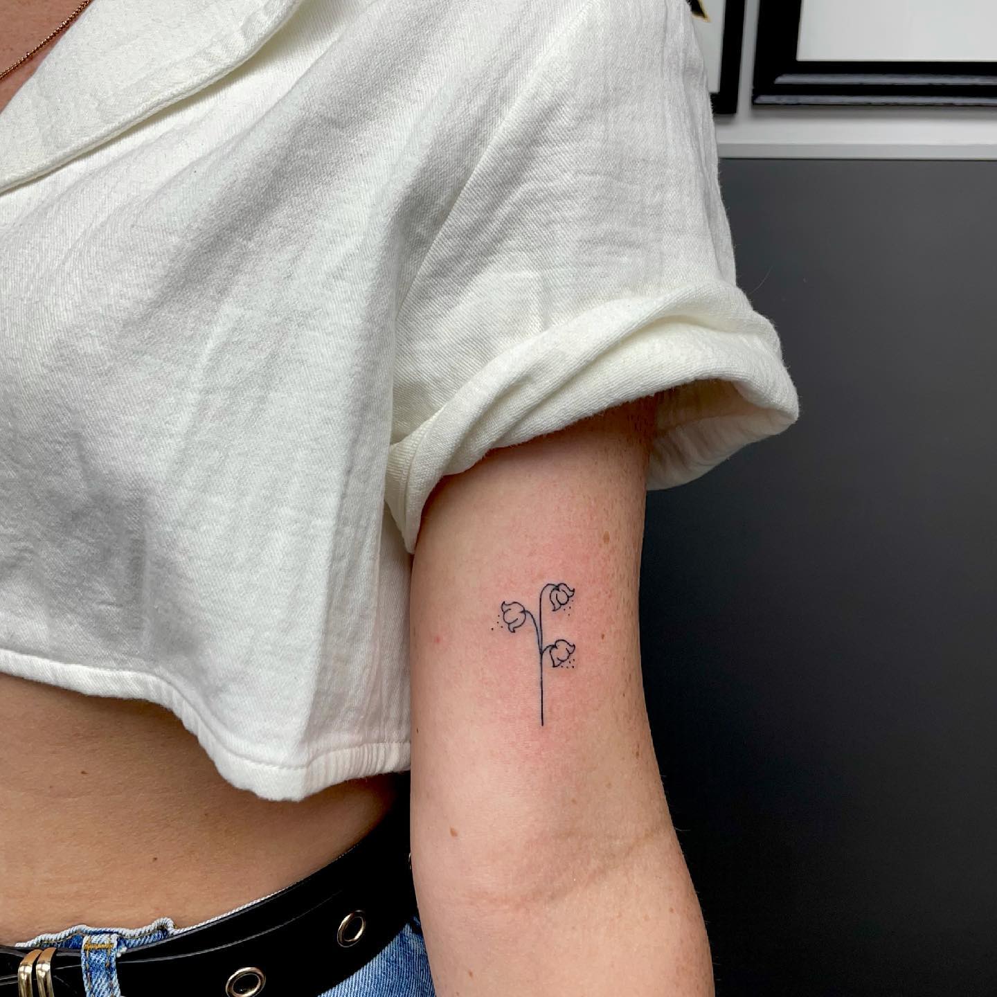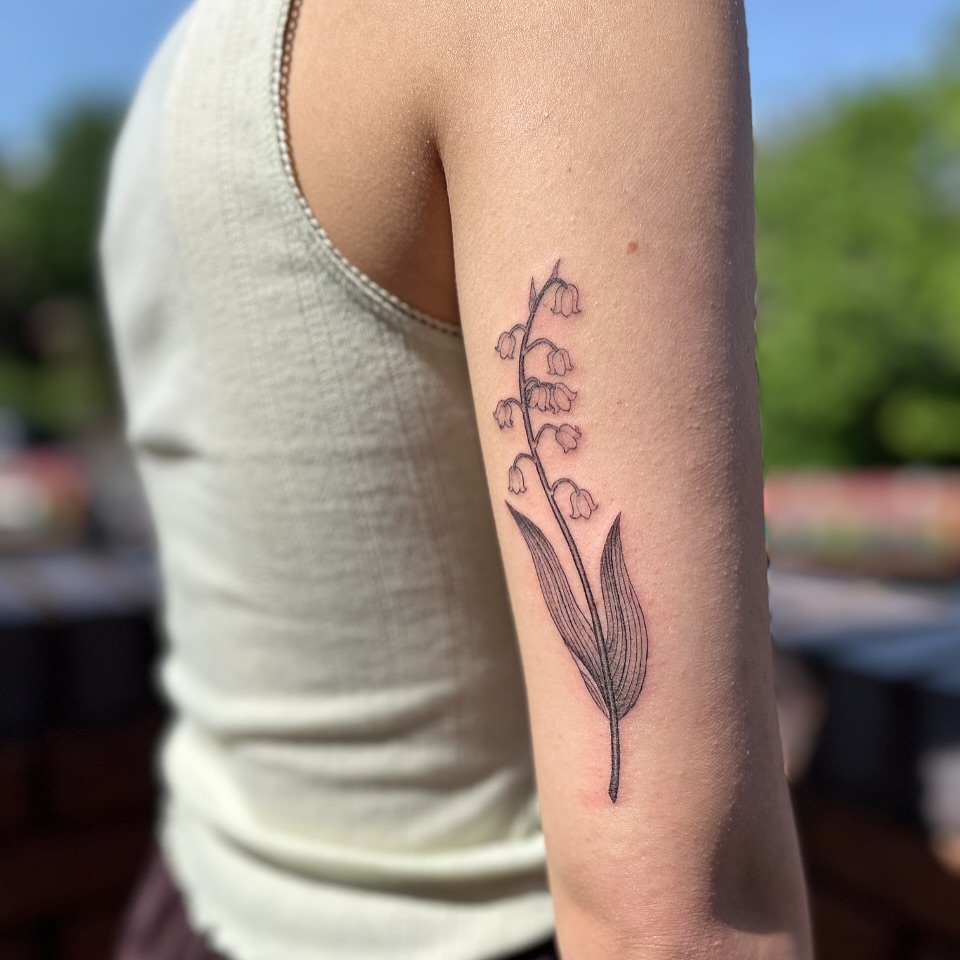 The tattoo features a slender stem adorned with multiple bell-shaped flowers, capturing the essence of the Lily of the Valley.