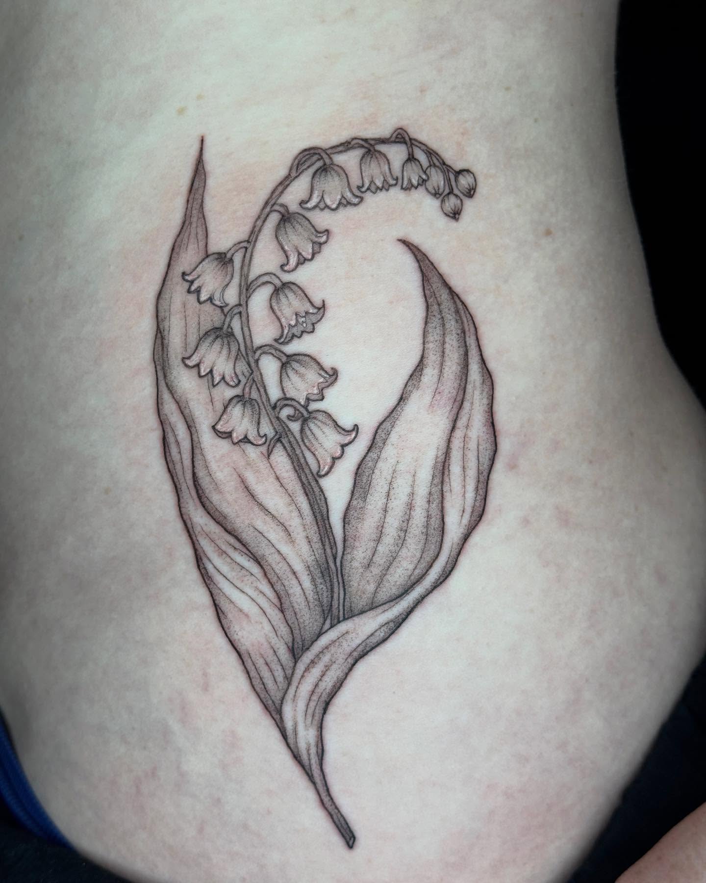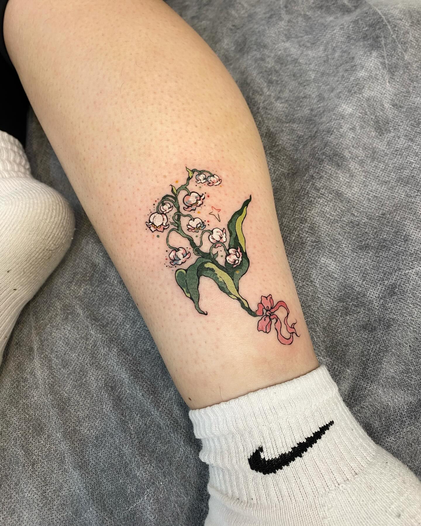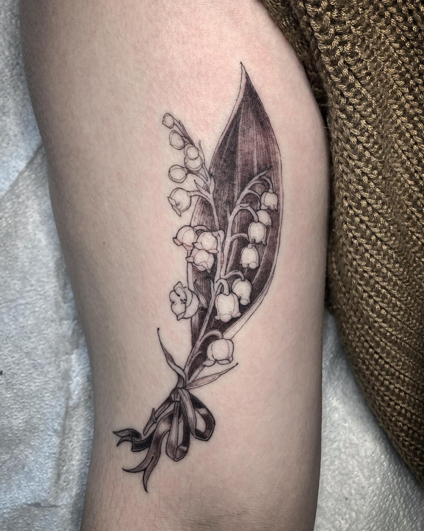 The tattoo features a delicate arrangement of Lily of the Valley flowers, elegantly intertwined with a large leaf and a ribbon at the base.