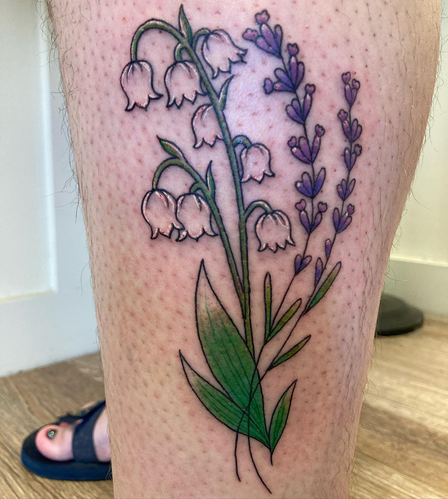 The tattoo features delicate Lily of the Valley blooms paired with slender lavender sprigs, creating a harmonious floral design.