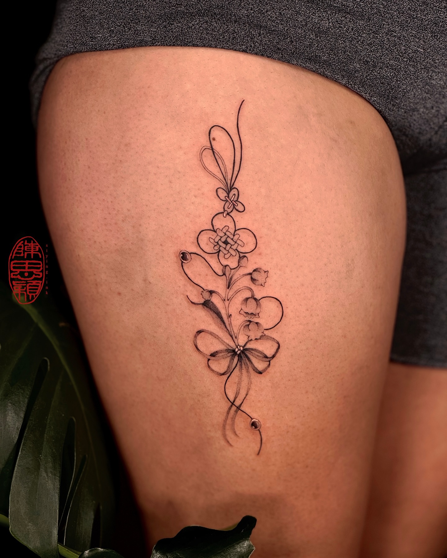 The tattoo features an elegant design of Lily of the Valley intertwined with small flowers and flowing lines.