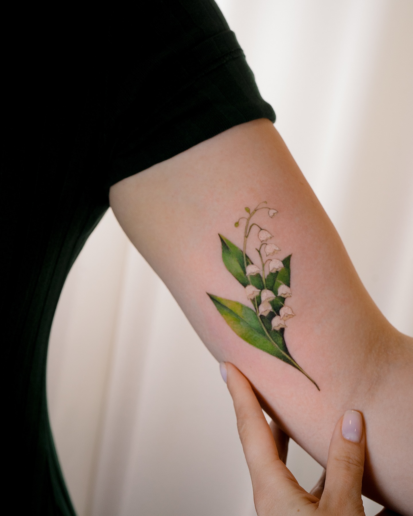 The tattoo showcases a graceful arrangement of lily of the valley flowers, highlighted by their distinct bell-shaped blooms.